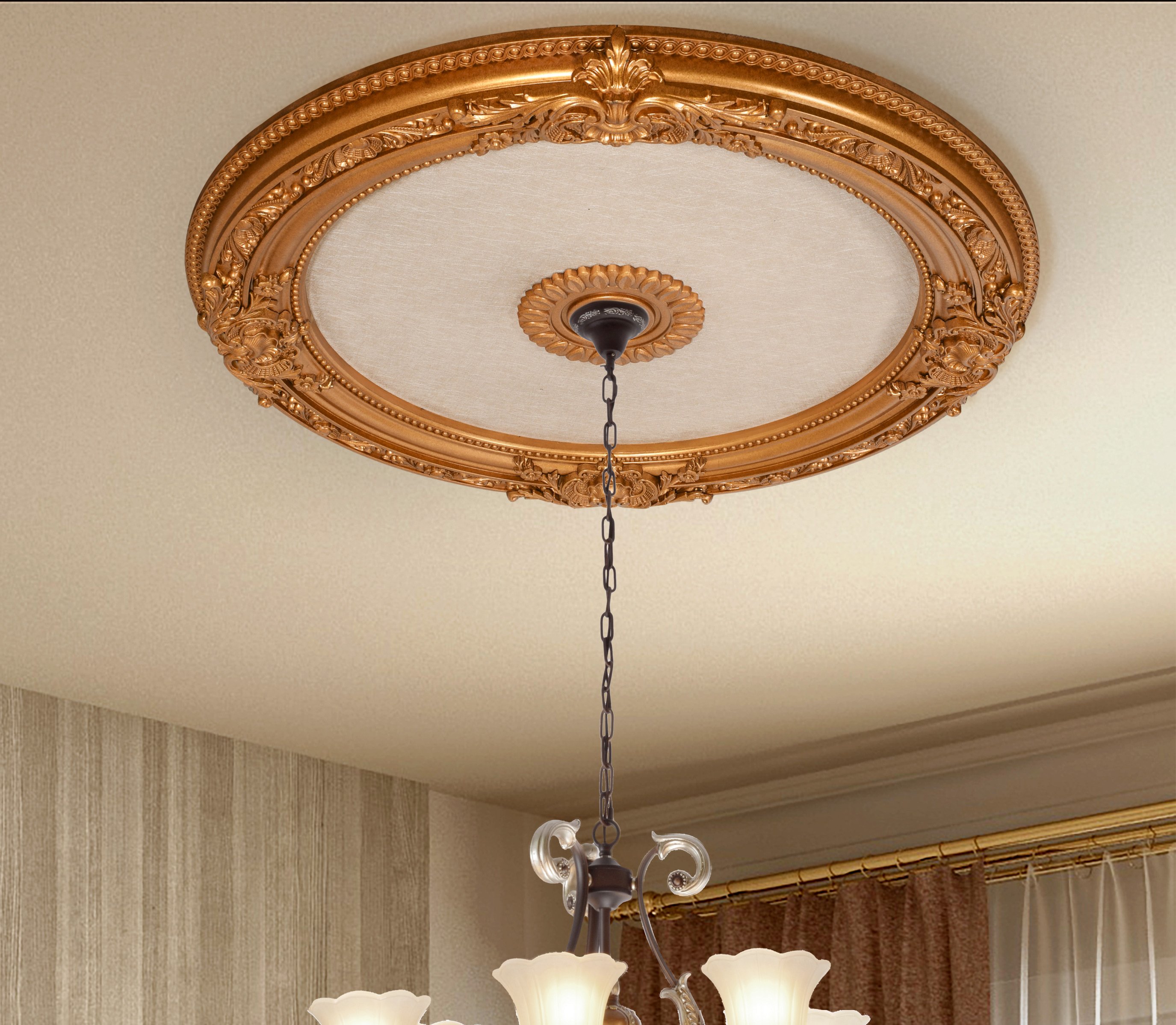 The Gold Beige Round Ceiling Medallion 36 Diameter is a favorite sized, fully assembled and intricately finished Ceiling Medallion. This medallion has a very placeable, classically inspired design and finishes featuring a soft gold with a neutral field. This completely finished Architectural Ceiling Medallion creates instant 3 dimensional detail to an otherwise boring plain ceiling. Also a crowning Elegance to a Chandelier Installation, which is often a good time to install your selected Medallion. The item comes fully finished out of the package and is Hand Cast in a lightweight Polystyrene that will never shrink, split or crack. Prior to Masterpiece Moldings creation of this Collection by AFD Home, the only way to have had an advanced ceiling with this level of design would have been a very expensive addition and an owner willing to take on an elaborate installation project, requiring carpenters, finishers, and in some instances even artists. One of the best parts about this item is that installation could not have been made easier, as the outer ring is created with a cabochon design allowing intermittent spaces specifically created as locations for your screws or hollow wall anchors, matching decorative caps are even provided that will cover the screw heads of your anchors and offer a complete professional looking install. A 1.5 inch center hole is provided for the installation of chandeliers and fans. The overall measurements are 36 x 3 x 36. Hollow wall anchors or installation screws are available at your local hardware store, as your need will vary depending on your ceiling.