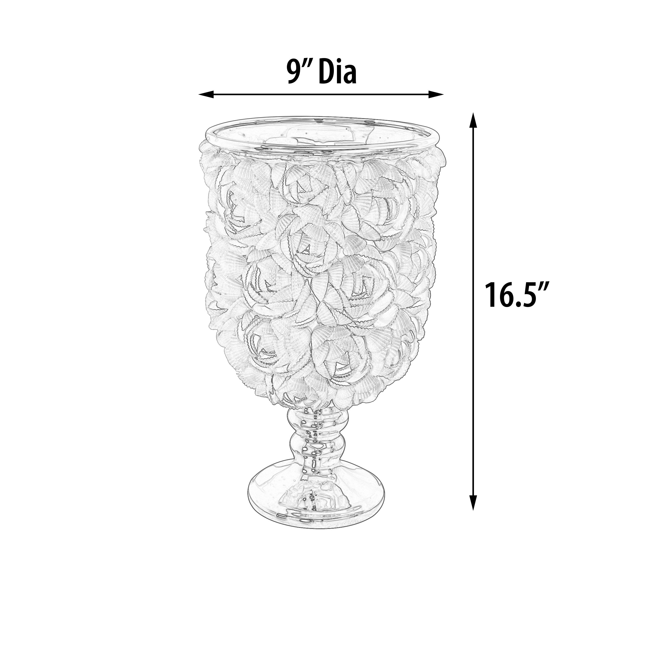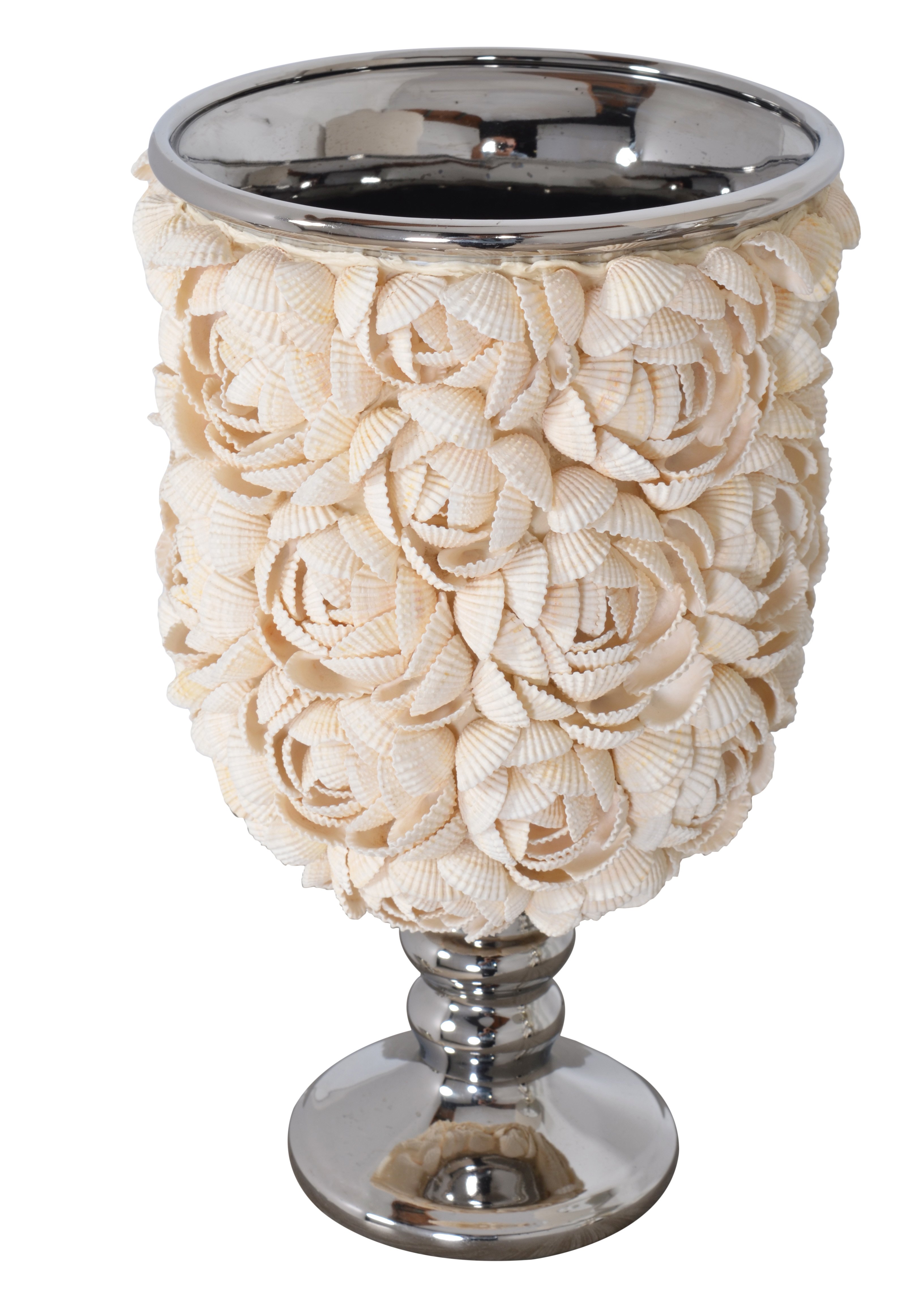 Amazing Shell Vase 16.5 Inches Tall. Thousands of fine Seashells are handset in an all over flower petal pattern. An artist created a coastal chic creation that brings a natural feeling indoors. Hand cast in porcelain with a striking silver plating, this Urn is beautiful and suitable for display as an art piece or used as an urn for an arrangement. Sold separately but consider a pair for Balance