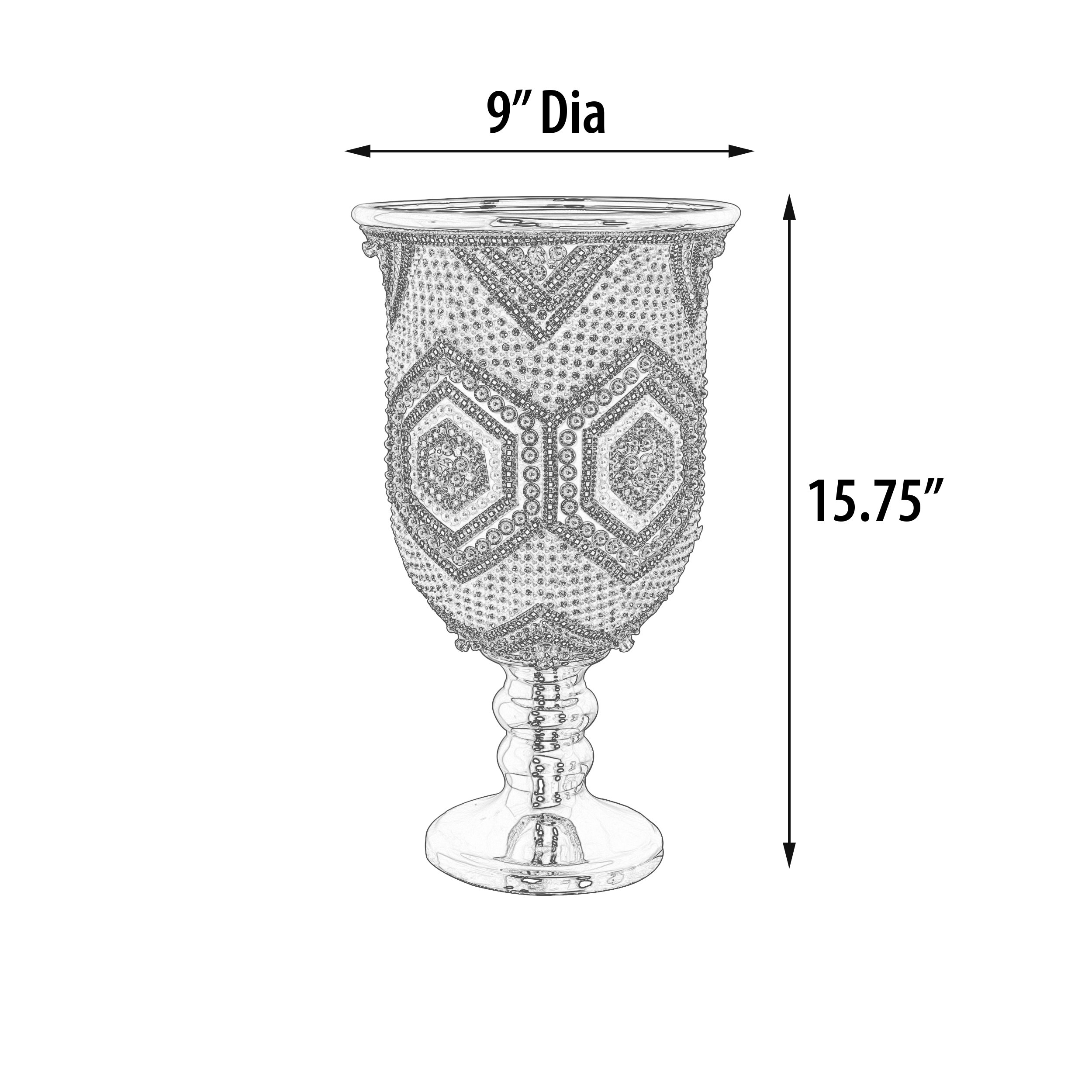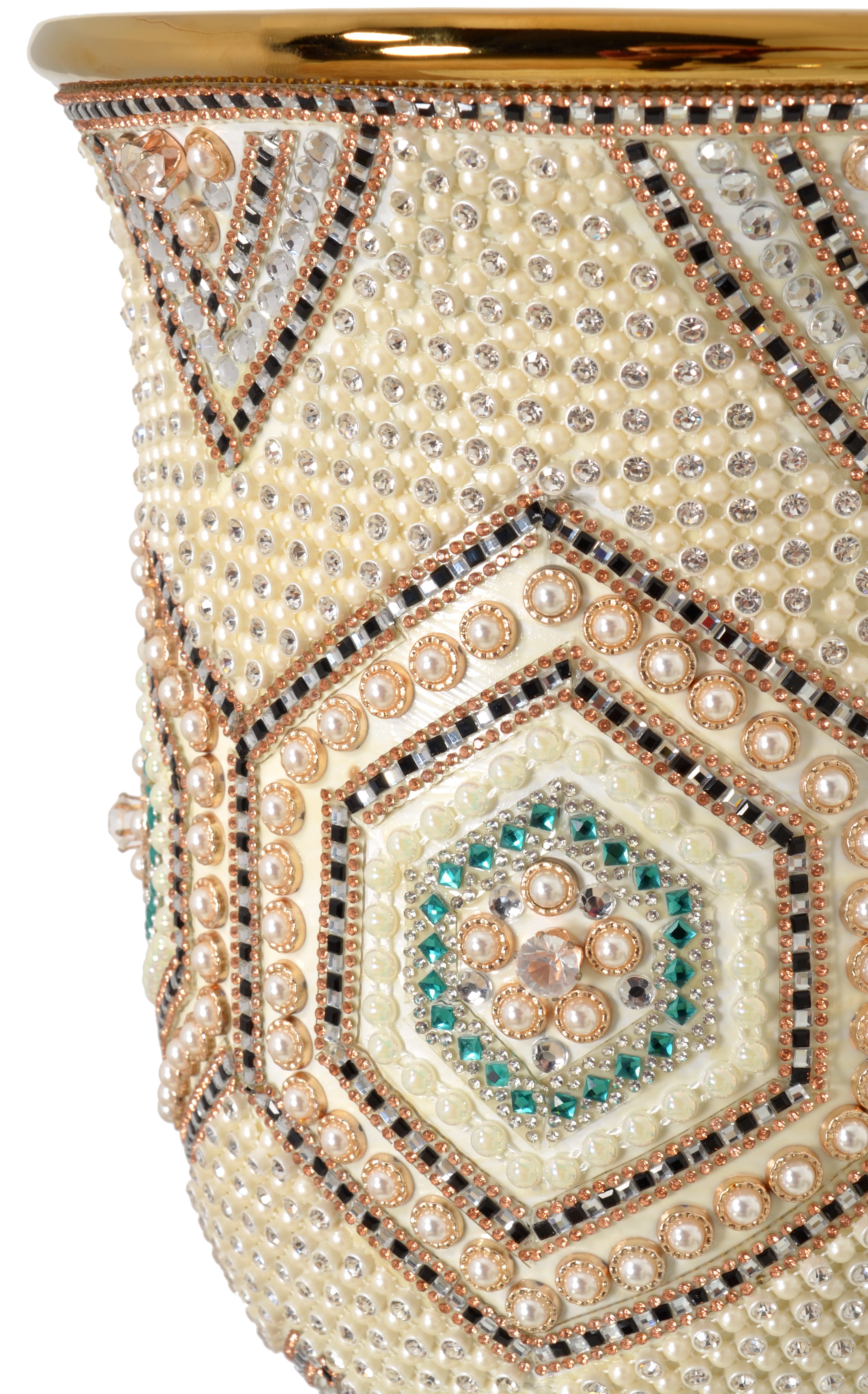 A 15.7 inch tall contemporary designed Moroccan Chalice Vase or Urn. The color combination is rich looking. It is a fresh and pleasing combination offering a modern vibe to traditional elements of design. Hand Cast in porcelain with Gold Plating. The Vase is adorned with hundreds of hand applied Rhinestone crystals and faux pearls arranged in striking colors of ivory, blue, clear, further contrasted by black accents and a striking gold base. Sold separately but often ordered in pairs for balance. Combine with other beautiful items from the new Moroccan Series for a larger collection. No Assembly Required.