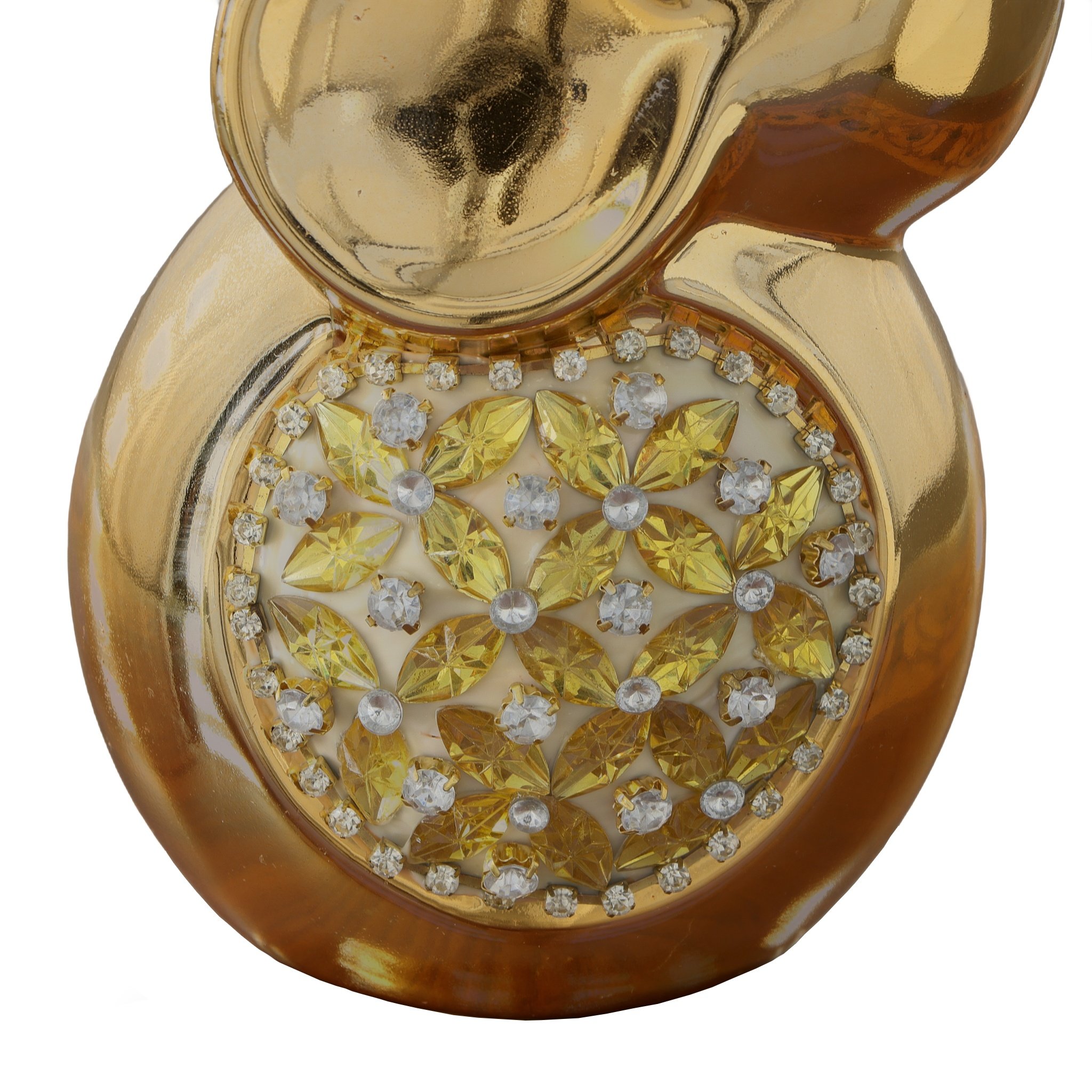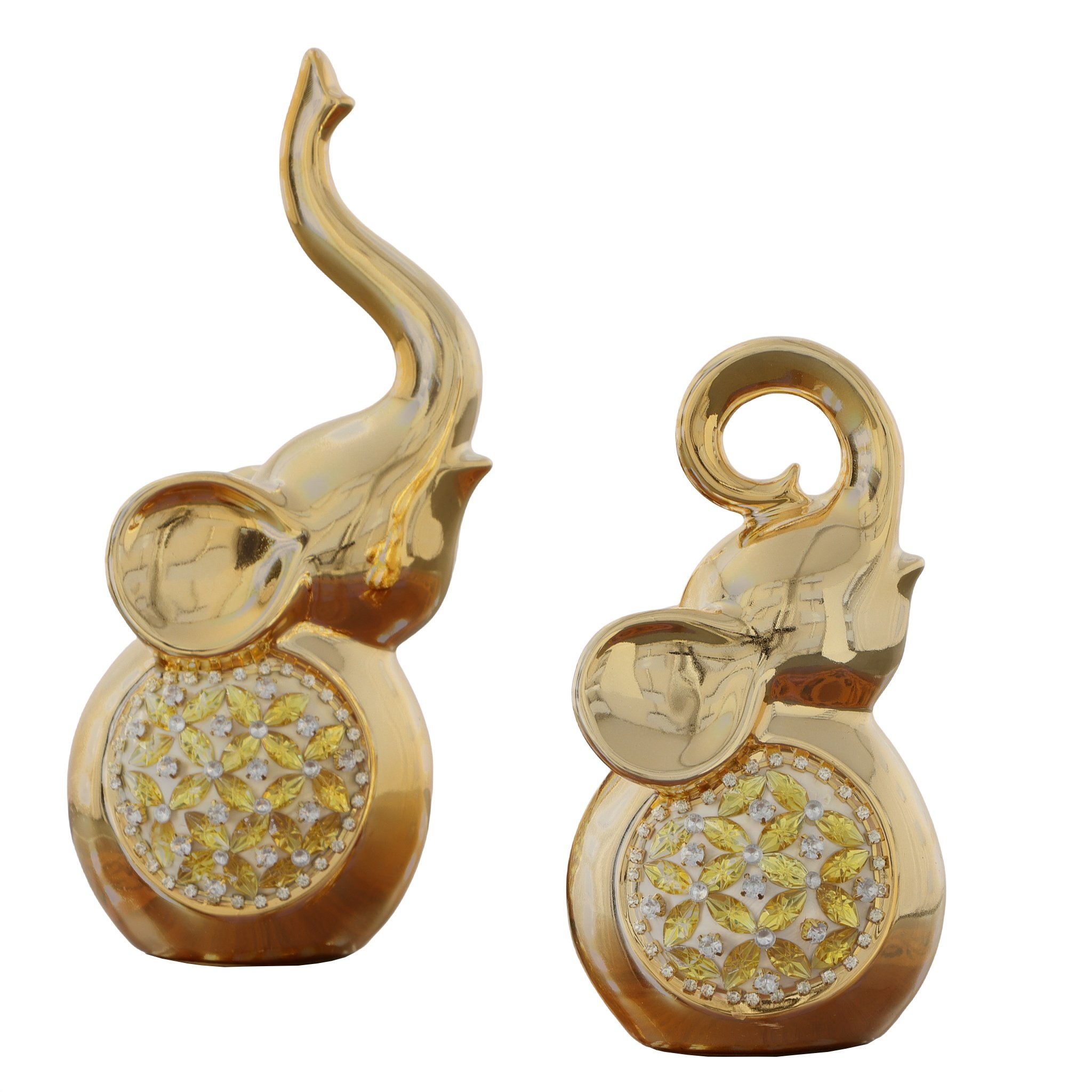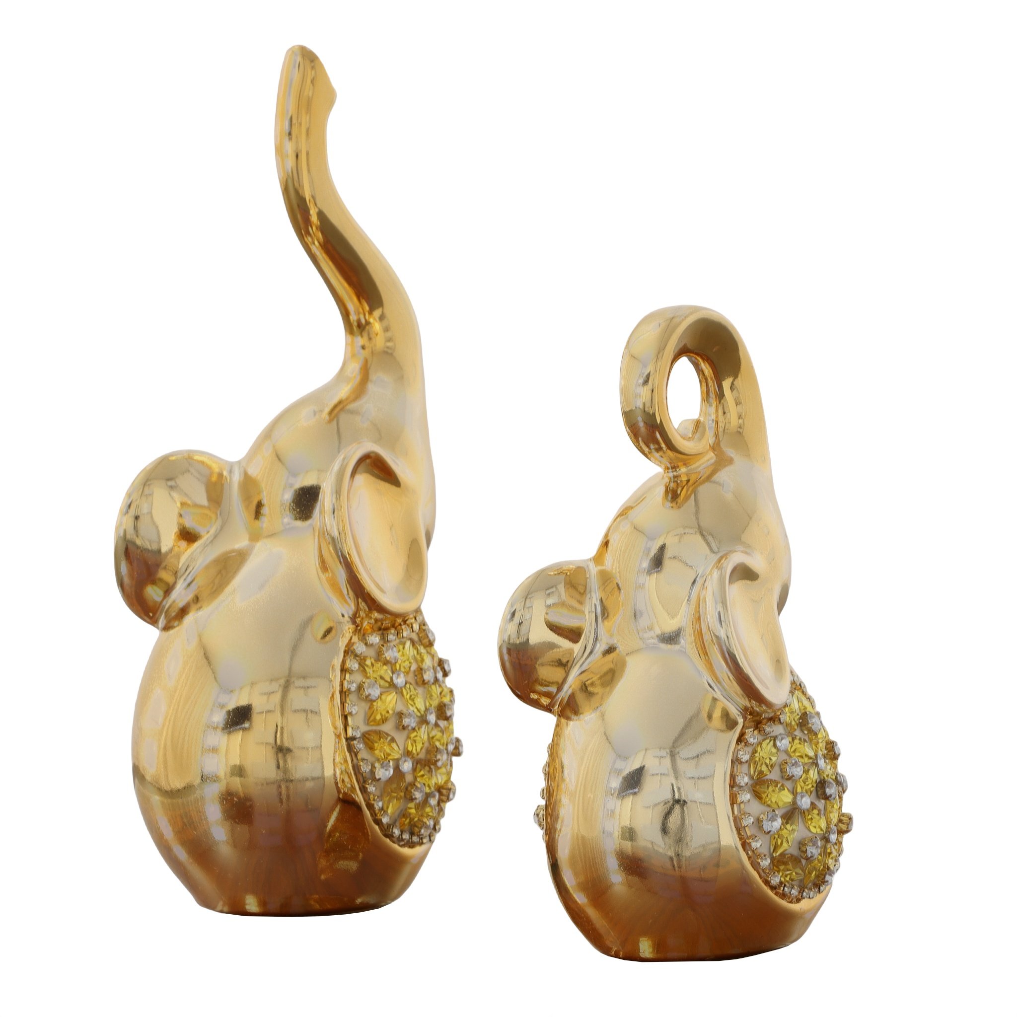 A contemporary set of 2 abstract Elephant sculptures with trunks was raised and positioned for good luck and good times to come. The Elephants are created with graduated heights as if to represent a mommy and child. Hand cast in Porcelain. The finish is a strikingly beautiful gold plating of the main sculptures' bodies and then further enhanced with amber and clear Rhinestones patterned in a pleasing flower petal design. No assembly is required.