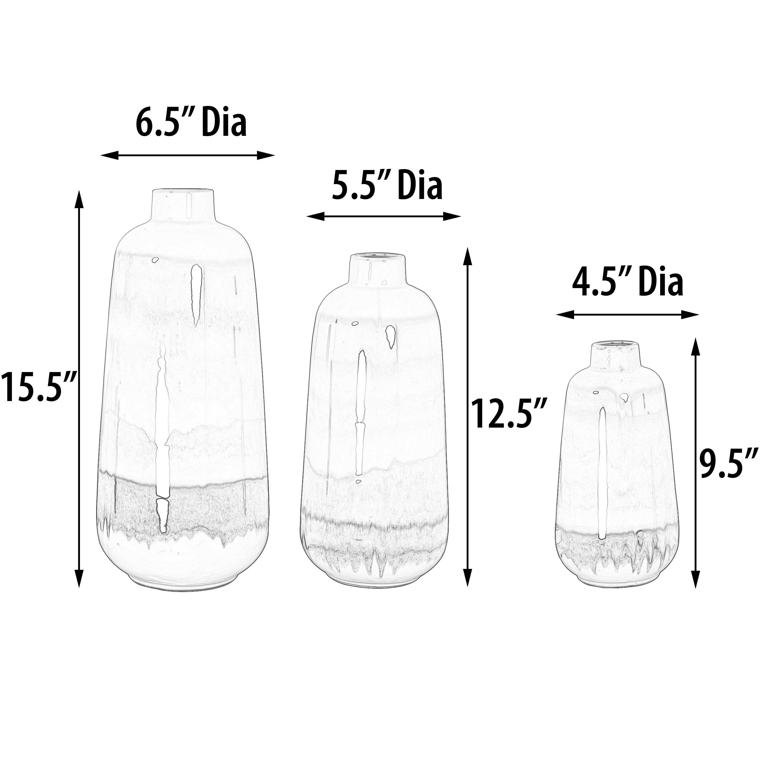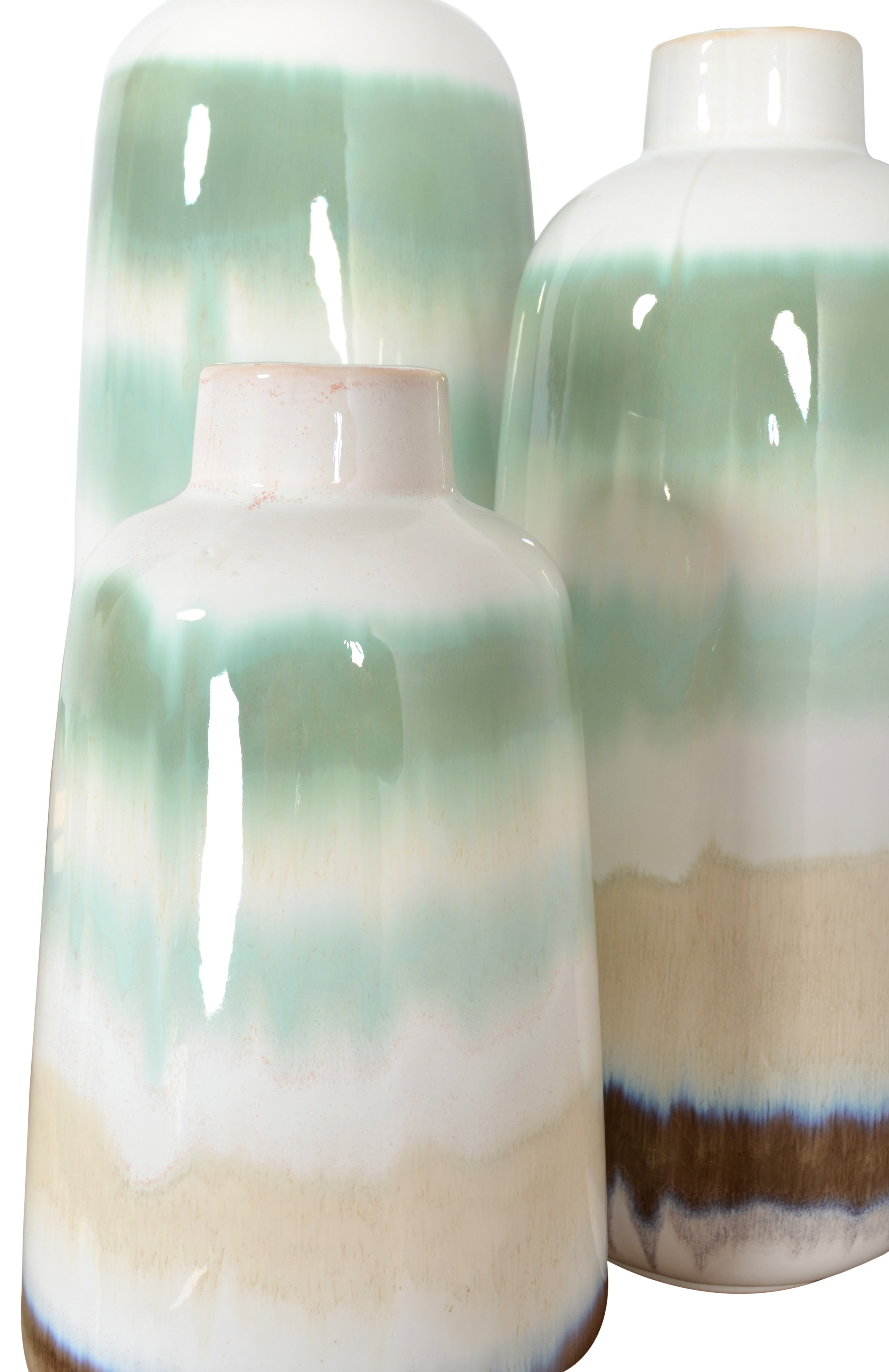A stylish Green Sand Vase Set of 3 offers three distinct Artistic Vases in varying heights widths. The set is Hand Cast in Porcelain. The finish uses an attractive fusion of different fashionable glazing colors over a white glazed form. They offer an artistic flair to functional shapes. The vases can be enhanced with flowers or used stand alone as decorative Objects of Art. No Assembly Required.