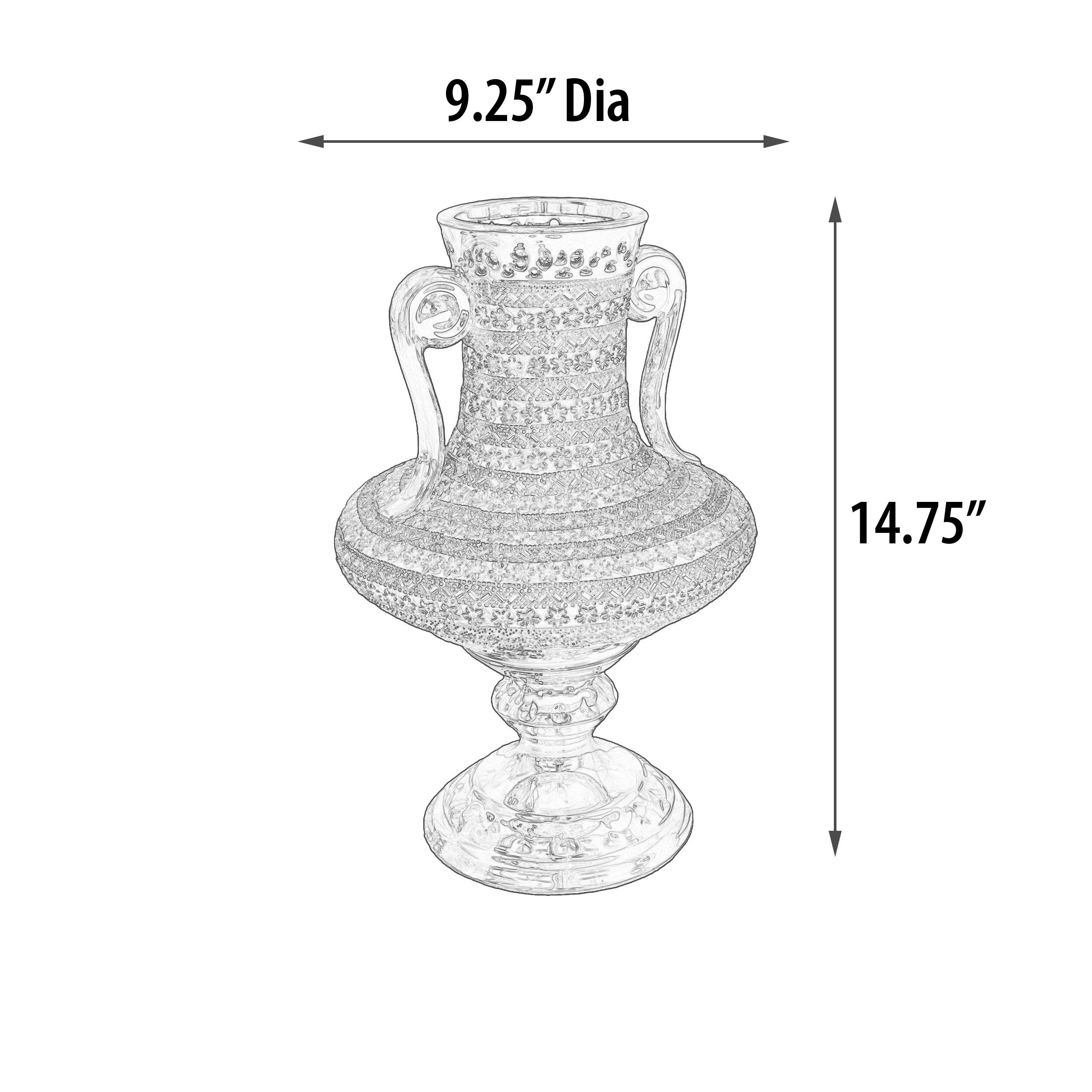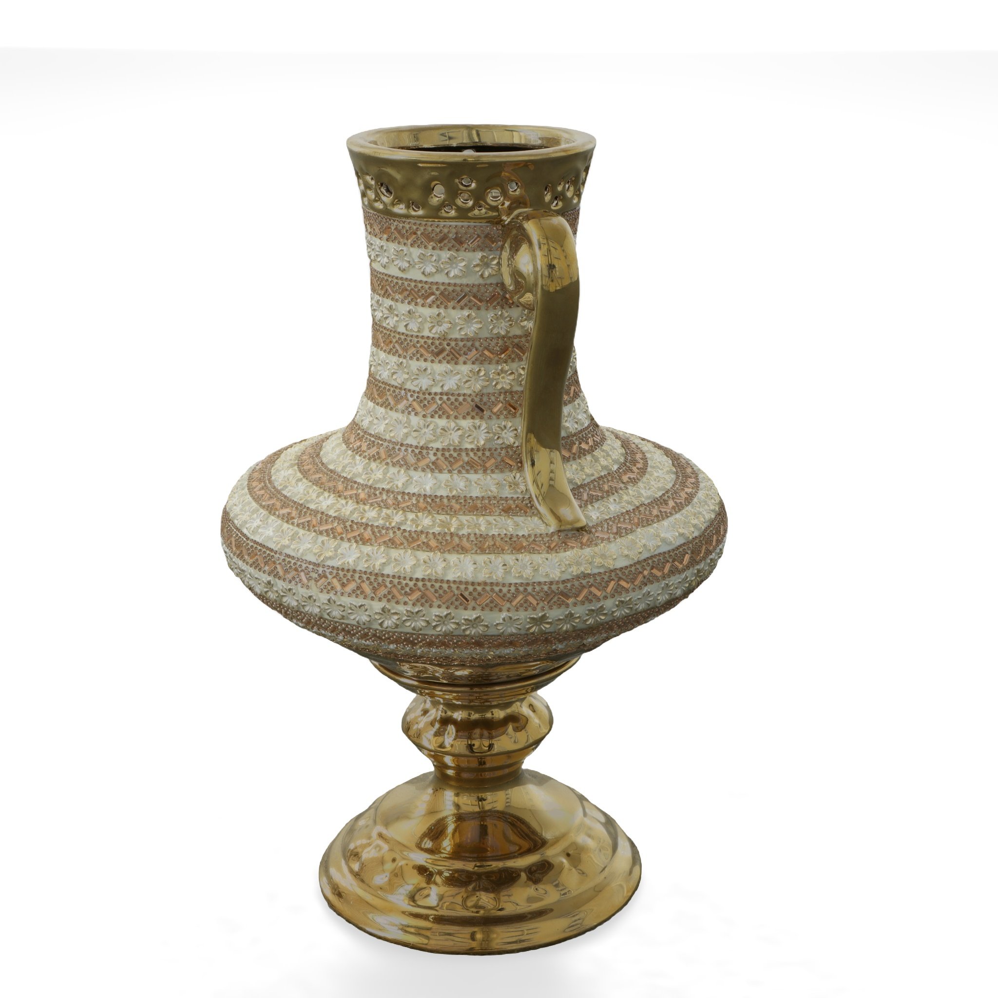A 14.76" tall Golden Floral Vase, This item is part of our popular Golden Floral Collection. Whether this decorative vase sits alone or it is the perfect vessel for a future flower arrangement, its presence will be noticed. The vase is hand-cast in Porcelain with gold plating. The vase features intermittent applied Rhinestone amber Crystals and petite floral appliques in ambers and whites. They contrast beautifully against the Gold plated finish on the body of the tall vase. The finished item offers a focal bit of sparkle and color that livens up the decor. It can enhance a traditional setting and also crosses into a more contemporary design. Consider ordering a pair for balance or symmetry!