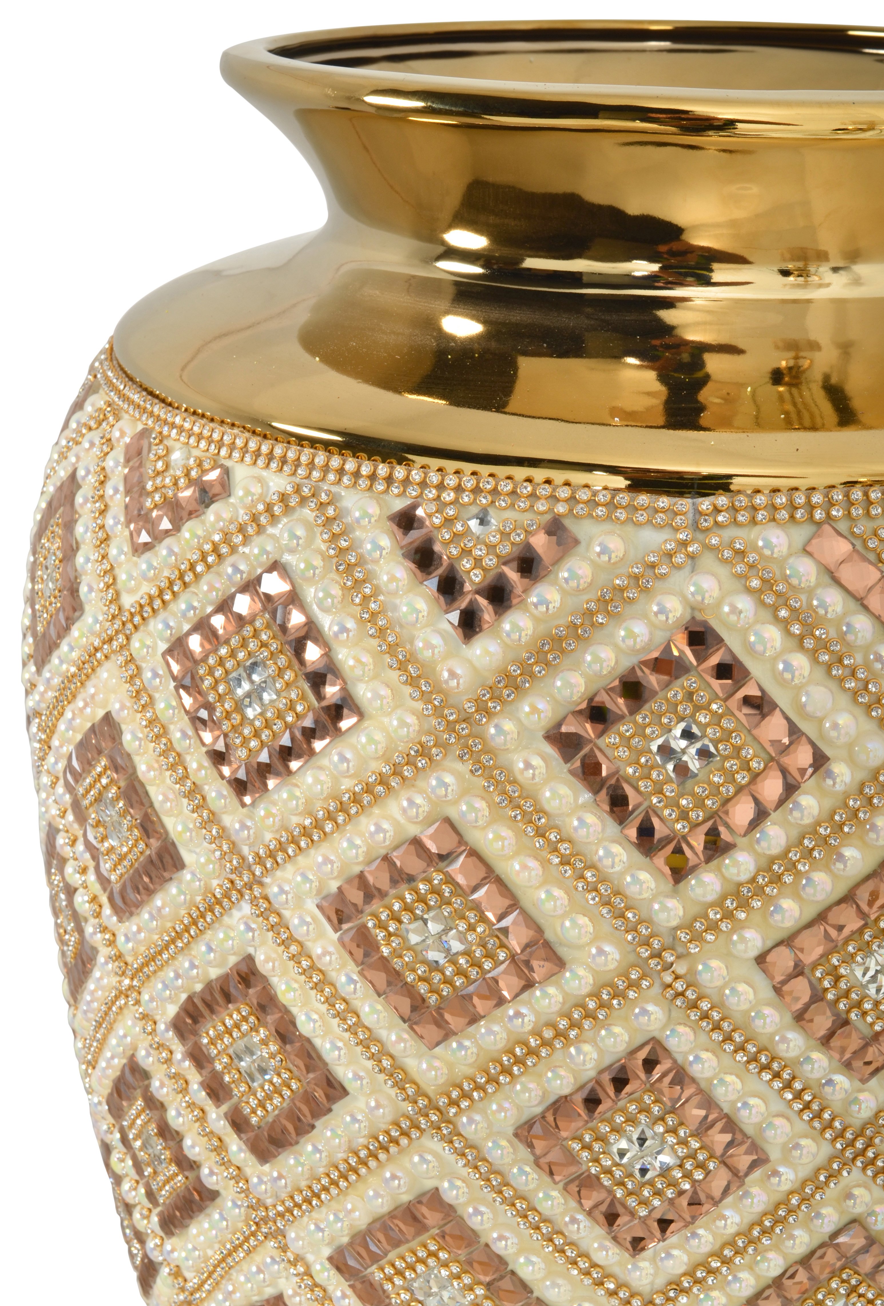 The Geometrical Jeweled Vase 20.1 Inches Tall is an impressive hand creation. A design featuring sparkle and contrast with thousands of individually hand applied elements of amber, white and clear rhinestone and pearl crystals. The main body of the urn is strikingly Gold plated. The creation is formed by hand casting in Porcelain. The overall effect allows its proper placement in styles from Contemporary settings to Traditional ones that benefit from a pop of sparkle and Bling. Whether a decorative object or enhanced with flowers, this vase is often ordered in pairs for balance and to create a bigger display affect. No assembly is required.
