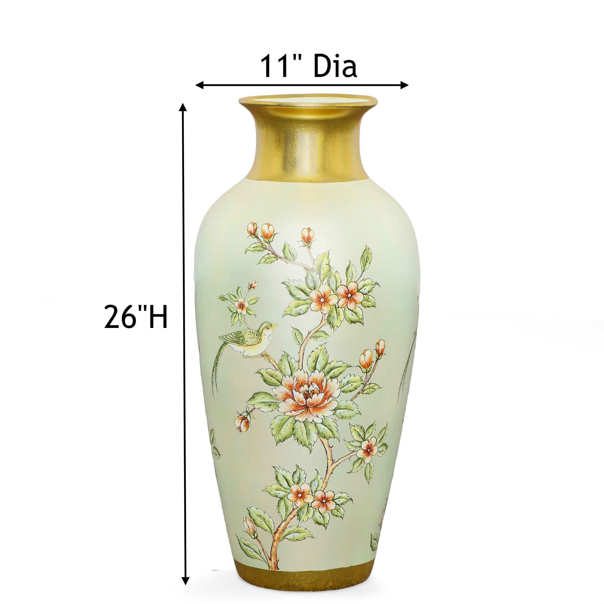 An Aviary Floral Chartreuse 24" Tall Vase. This beautiful vase is part of a new Aviary Floral Series. The item is hand cast in Porcelain and hand-finished is a soft greenish hue, accented with gold. The overall design embodies a delicate pattern of flowers and birds. The item can be combined with other matching items from the collection, and while beautiful enough to stand on its own, it can also be further enhanced as a vase for flowers. Consider ordering a pair for balance or symmetry. No assembly required.
