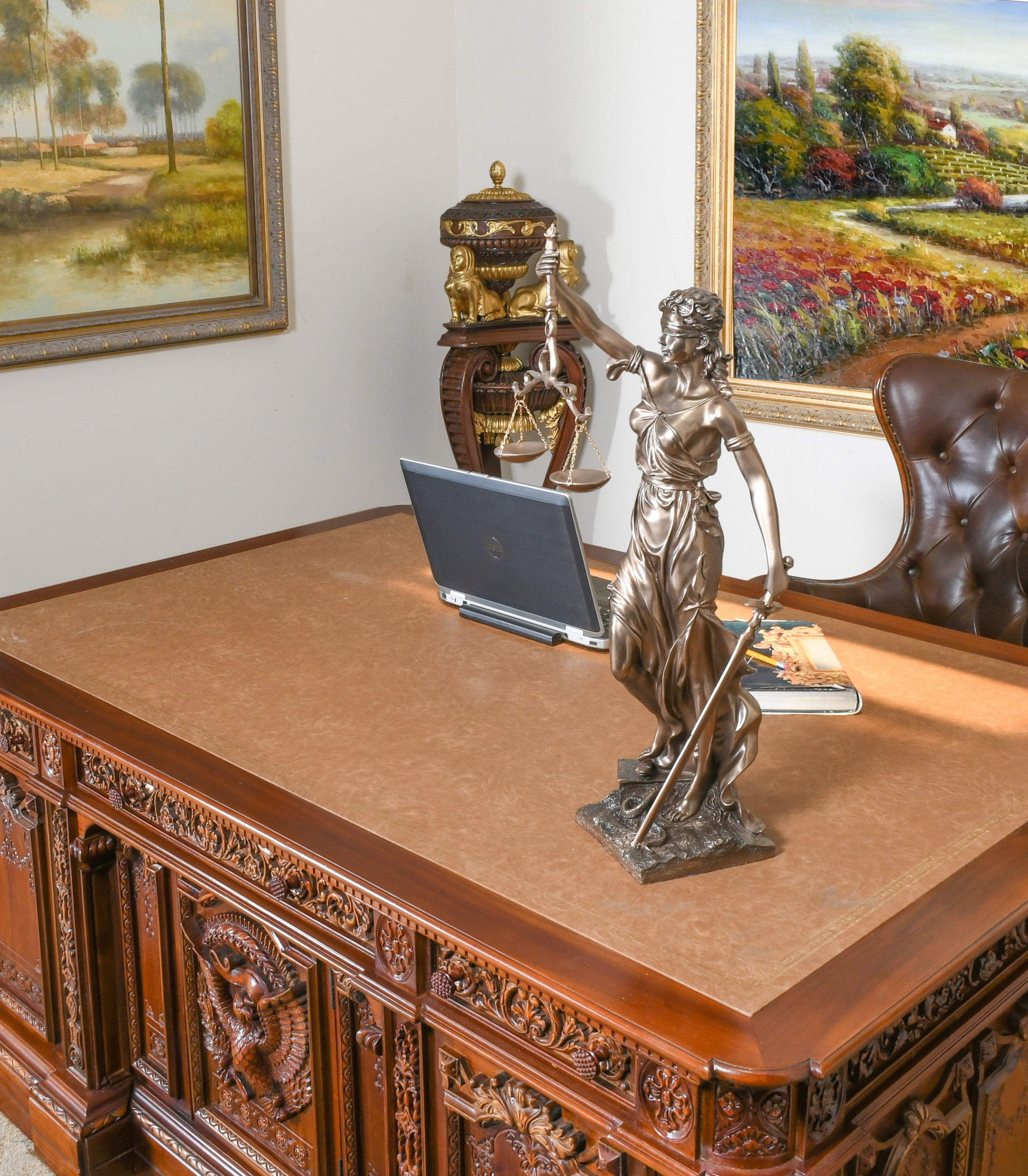 Our Bronzed Justice at 11" wide x 9" deep x 32 " tall is from our popular Platine Metal Series. This meaningful classic sculpture represents the foundation of our system of justice and was artfully depicted as a reminder to those of the beauty and strength of our system. The scales held by Lady Justice symbolizes the measure of a case's support and opposition, the blindfold on her represents no preconceived determination. The re-creation was Artist sculpted and then hand cast in Polyresin. It features our special and rich Platine metal plated finish. A finish that enables the artists to burnish and polish the details creating a very expensive looking yet affordable decorative art.