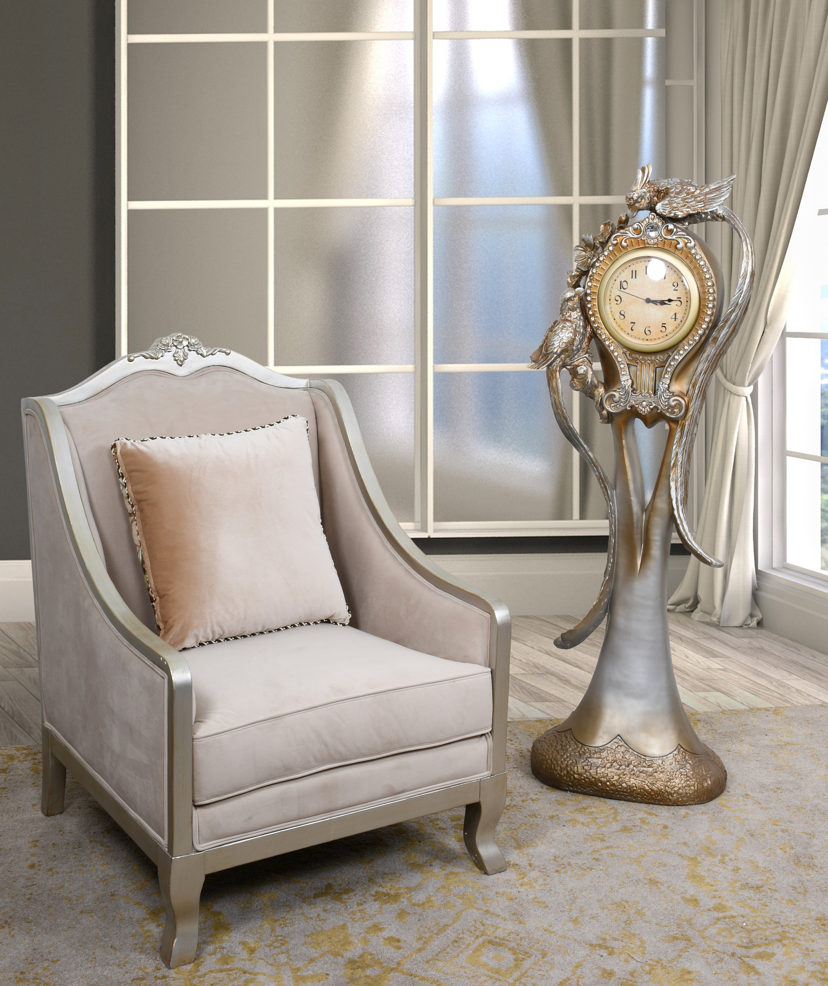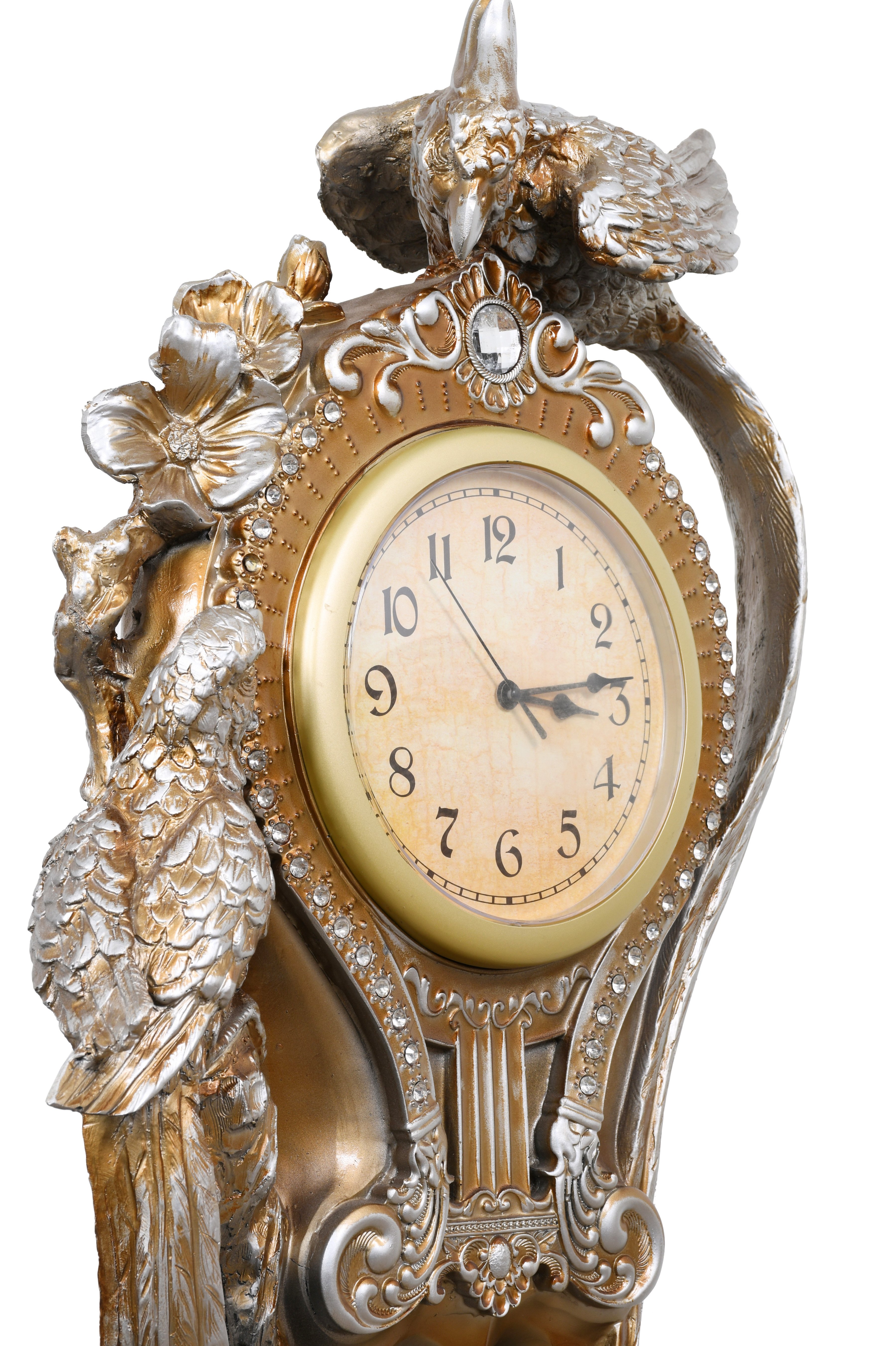 Our Parrot Floor Clock is large, at 17" wide x 17" deep x 52" tall. This standing floor clock is a very unique design that will surely grab attention. The original master was hand carved and cast in a durable Polyresin. The finishing is elegant with a silver base and hand highlighted with golden hues of umber that draws the details and creates a blended overall rich affect further enhanced with the application of Rhinestone jewels. The clock is battery operated. It comes fully assembled.