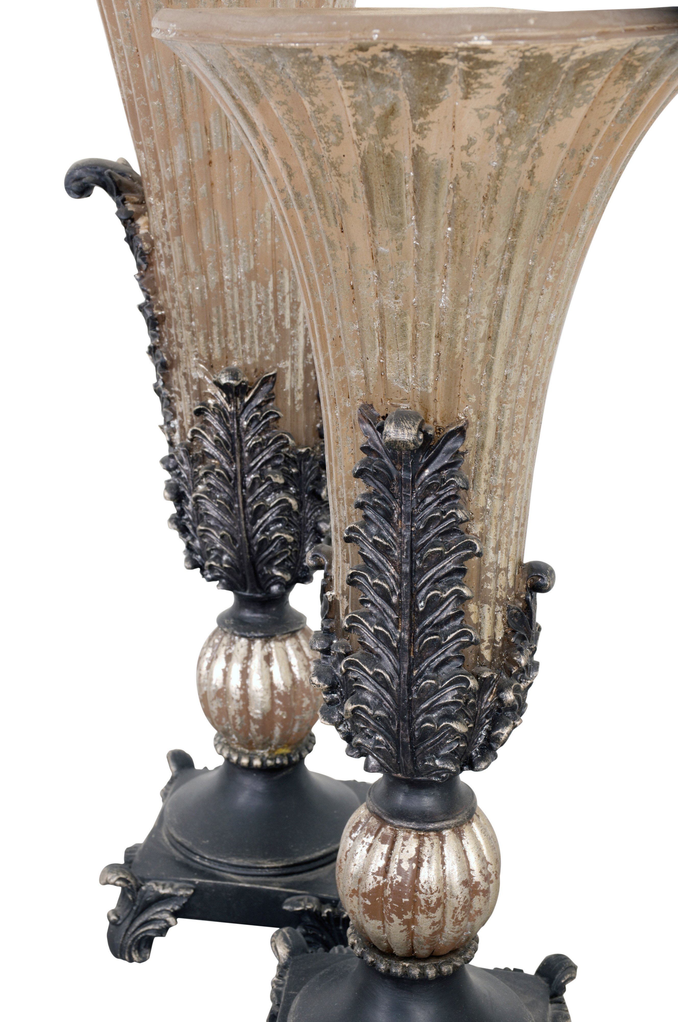 An elegant pair of vases for a Traditional Setting. The vases are Hand Cast and Hand Finished using an alluring Shabeen Silver Metal Leaf over an opalesque form. Final dark antiquing is rubbed on to bring out the carved details and undertones, giving each piece uniqueness. The vases are beautiful enough to stand on their own but are often enhanced with Flowers. The hand cast vases are accented with acanthus leaves on footed pedestal. They are graduated in size to create interesting displays. The Acanthia Collection also offers a matching Table Lamp Set. No Assembly Required.