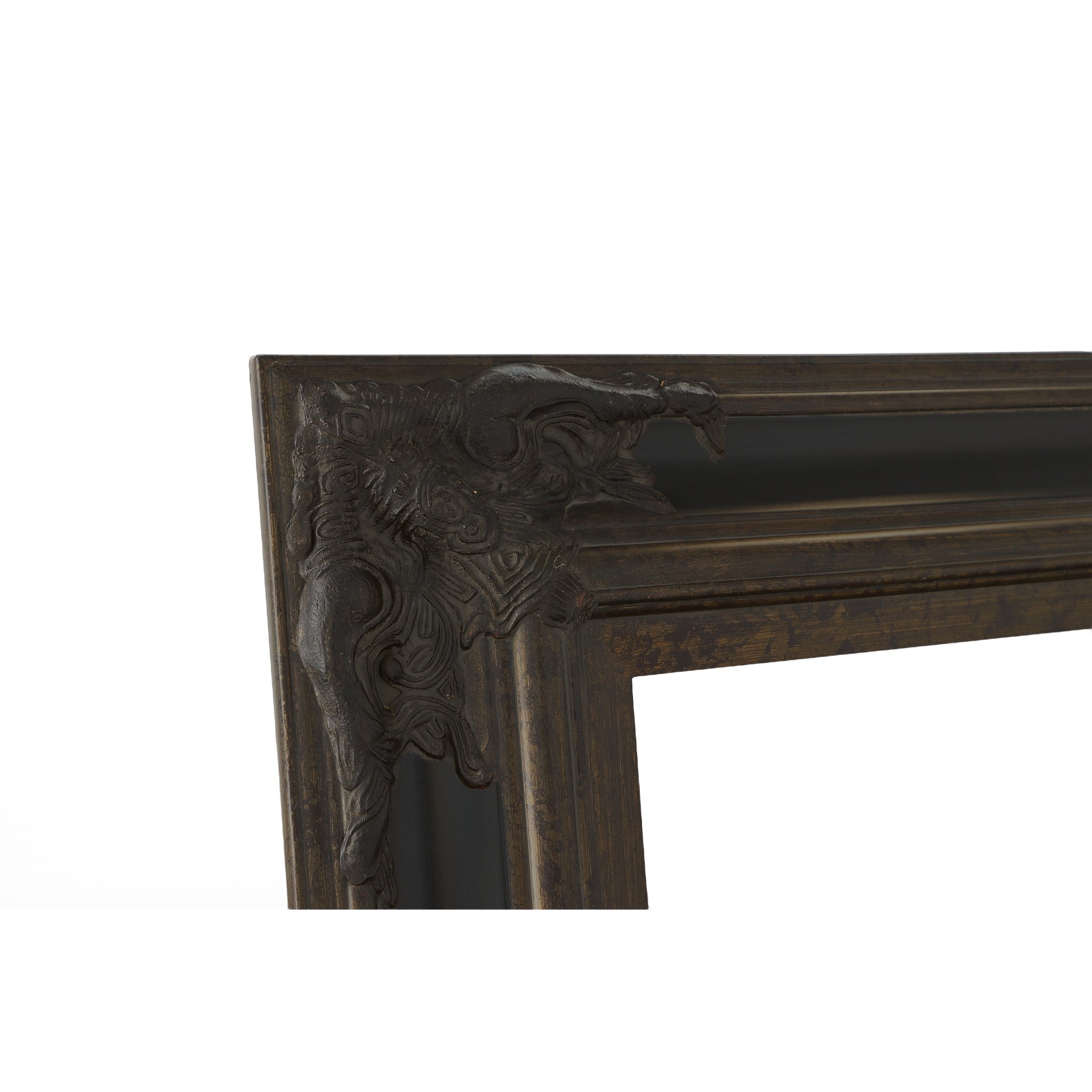 Interior size is 36 x 48 with an overall exterior dimension of 50 x 62 with a profile width of 7 " and a profile height of 2.75" . Our Elegantly Grand Frame is a robust design in solid wood that will add attention and value to the subject at its center. The finish features an interior center scooped profile in a defining black that is surrounded by a Tarnished silver leaf on the exterior , interior and wood liner. The finish and profile combine to deliver a wonderful framing result suitable for both traditional or transitional applications.