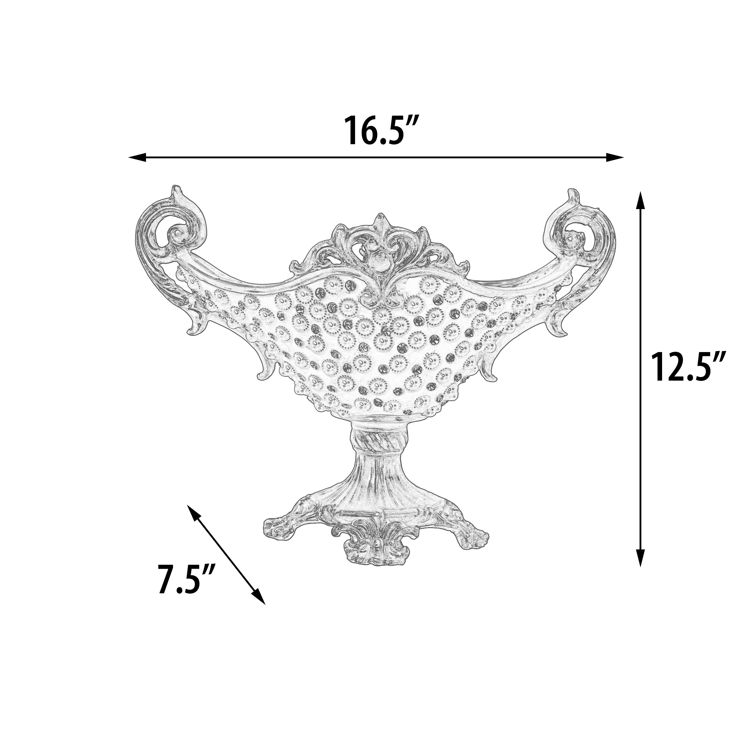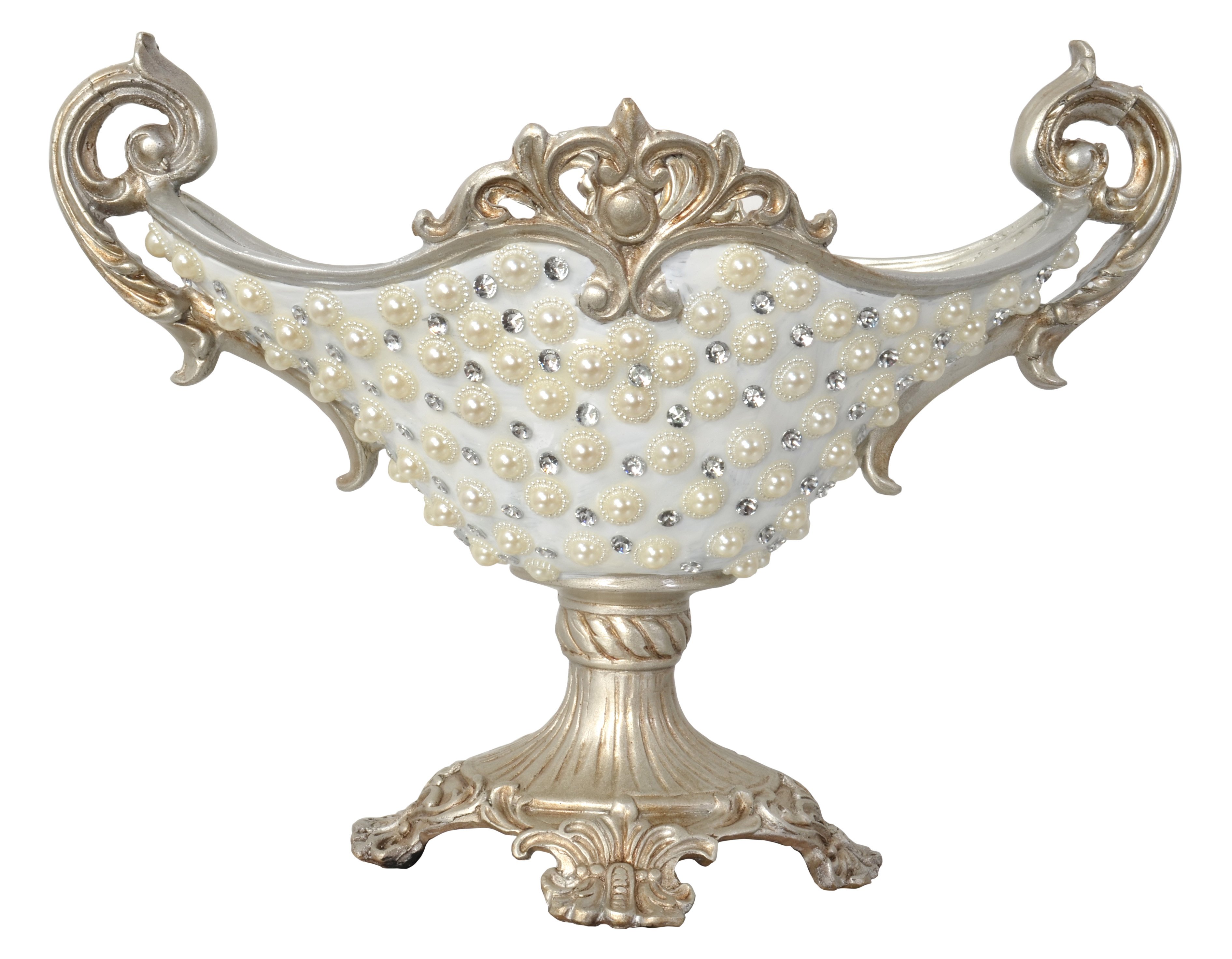 Silver Pearl Centerpiece Vase 16.5 Inches wide is A beautiful vase 16.5" wide x 12.5" tall. The artist designed vase combines function and beauty with meticulous hand applied jewels and faux pearls intermittently placed all over its shapely design against contrasted accent tones of silver with antiqued glaze that draws out the details in the carvings. Sold separately but often ordered in pairs for balance, the vase also pairs nicely with other items from the Silver Pearl Collection for an expanded themed display. The item is hand cast in durable polyurethane resin.