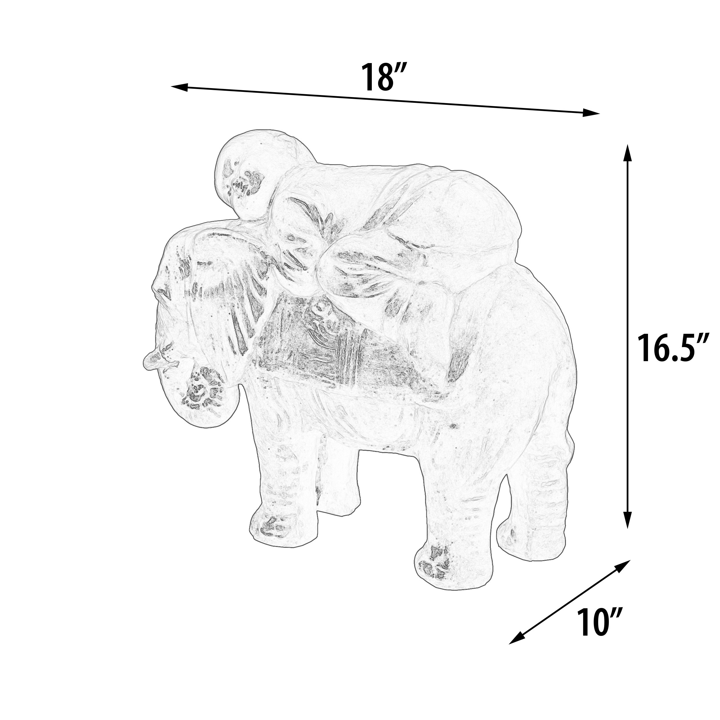 The Baby Monk On Elephant Black Earthy Finish 18" wide X 16.50" tall is a Sculpture offering a sweet perspective of a Baby Monk asleep on top of a baby Elephant. The sculpture is hand cast and hand finished in a durable fiberglass and cast stone reinforced material. The Black Earthy Finish is durable and offers an authentic antique quality and richness to this adorable Baby Monk creation. Monks are highly respected and often loved for the strengths of their beliefs and the sacrifices made for religious reasons and live cleaner simpler lives. The sculpture is suitable for Outdoor or Indoor use. The item arrives completely assembled.
