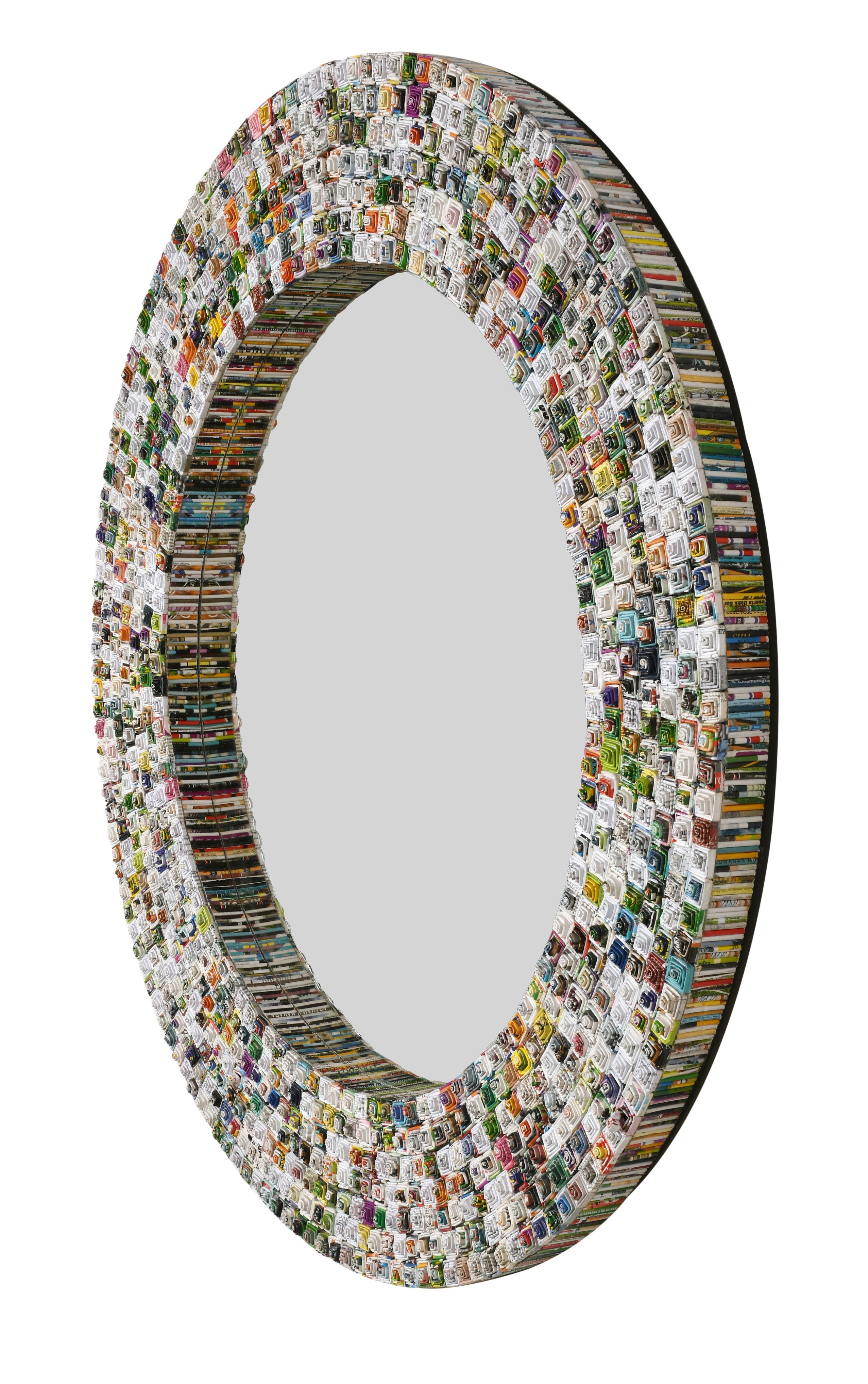 Our quilled Large Pyramid Art Mirror 47" Round. The Art of quilling, an ancient art created hundreds of years ago during the Renaissance when nuns and monks would roll gold-gilded paper remnants creating beautiful works of art and religious objects in this meticulous and time consuming art form. Today, artists from a small village in a remote town west of Bali make their living executing this traditional art passed on from generation to generation and quill for AFD Home beautiful and collectable works of art for Today's appreciating Collectors and for a Modern Decor placement. The beautiful Pyramid Art Mirror offered is just such an item, while the mirror offers function for every day use, the item posses to true collective beauty in its colorful, vibrant and unique Hand quilled Frame. It truly is more then just a mirror, this is an authentic piece of Collector's Art. Enjoy!