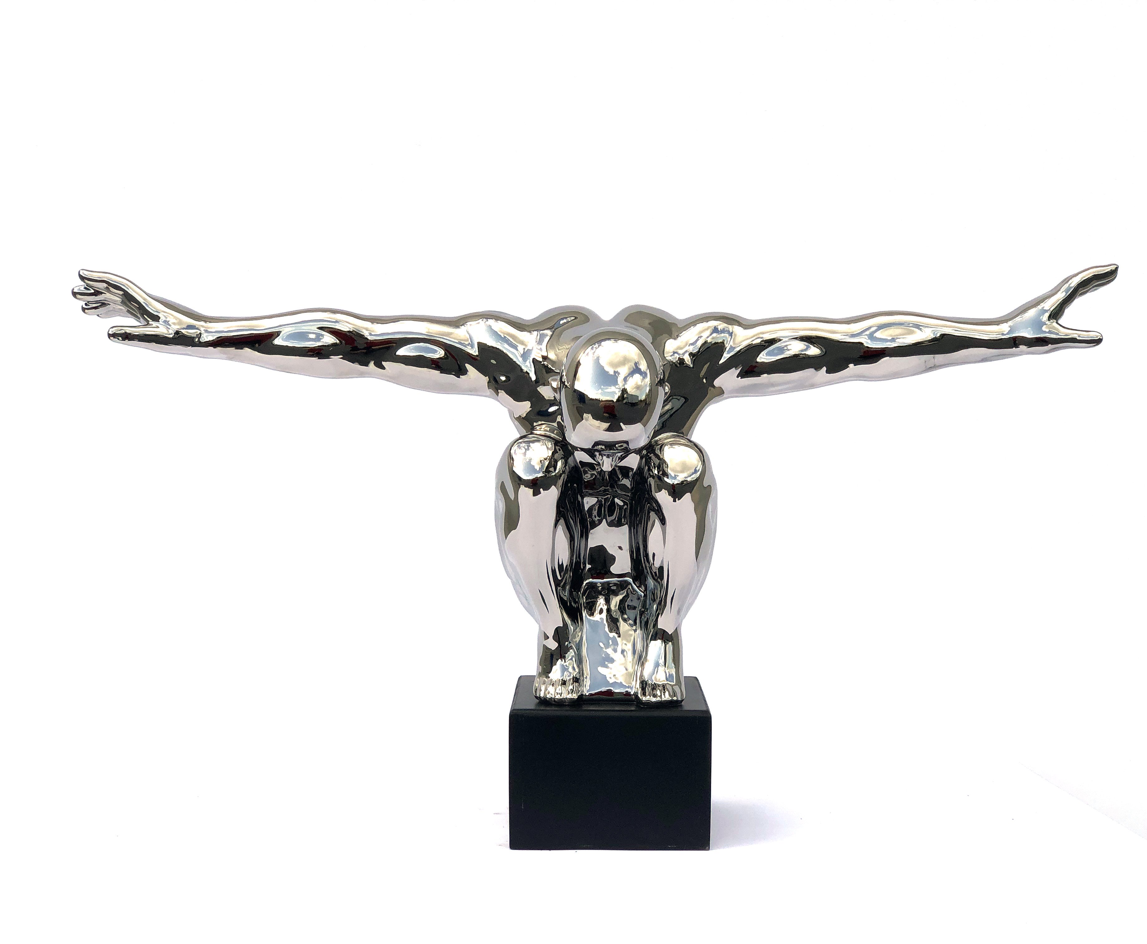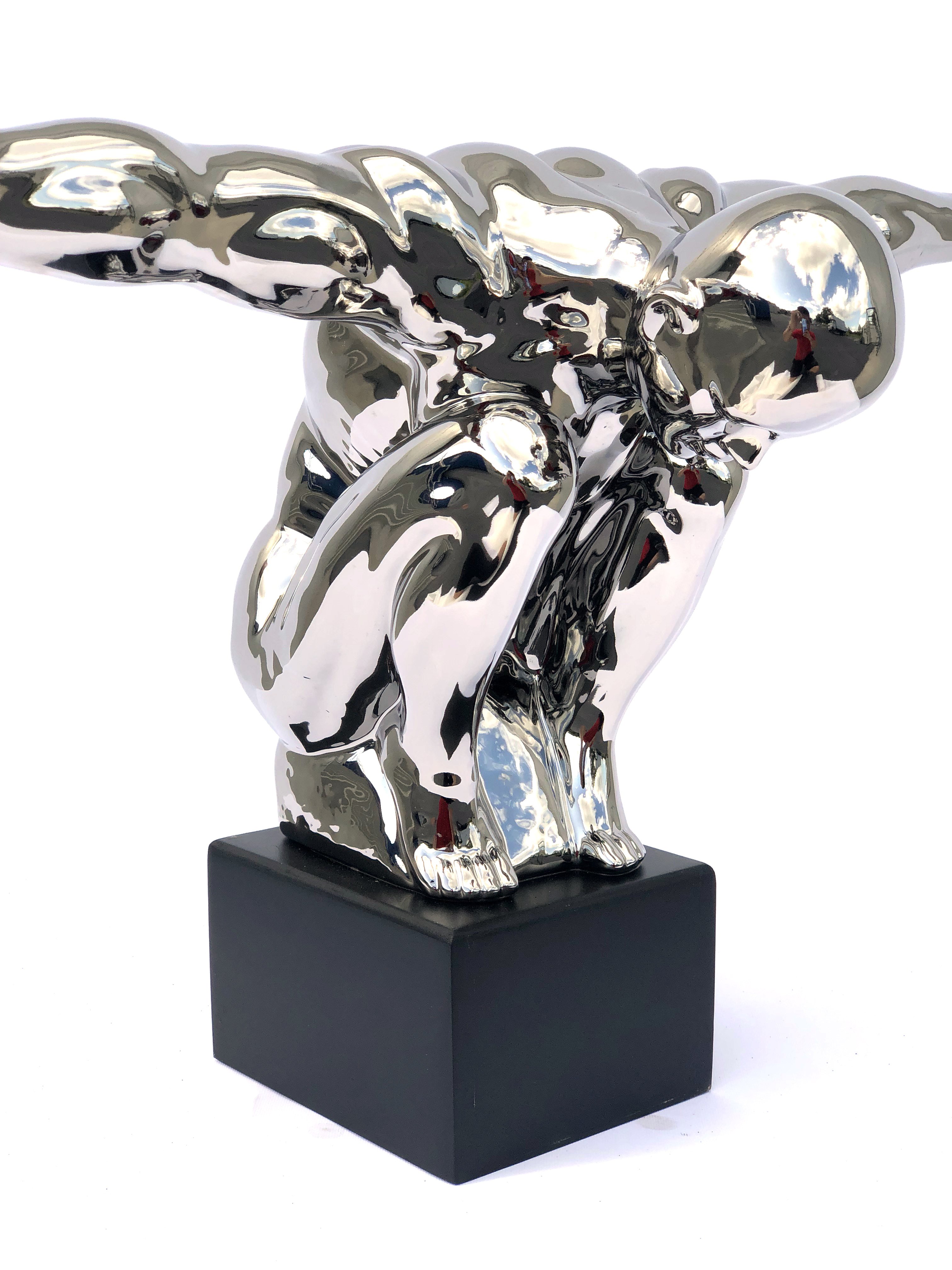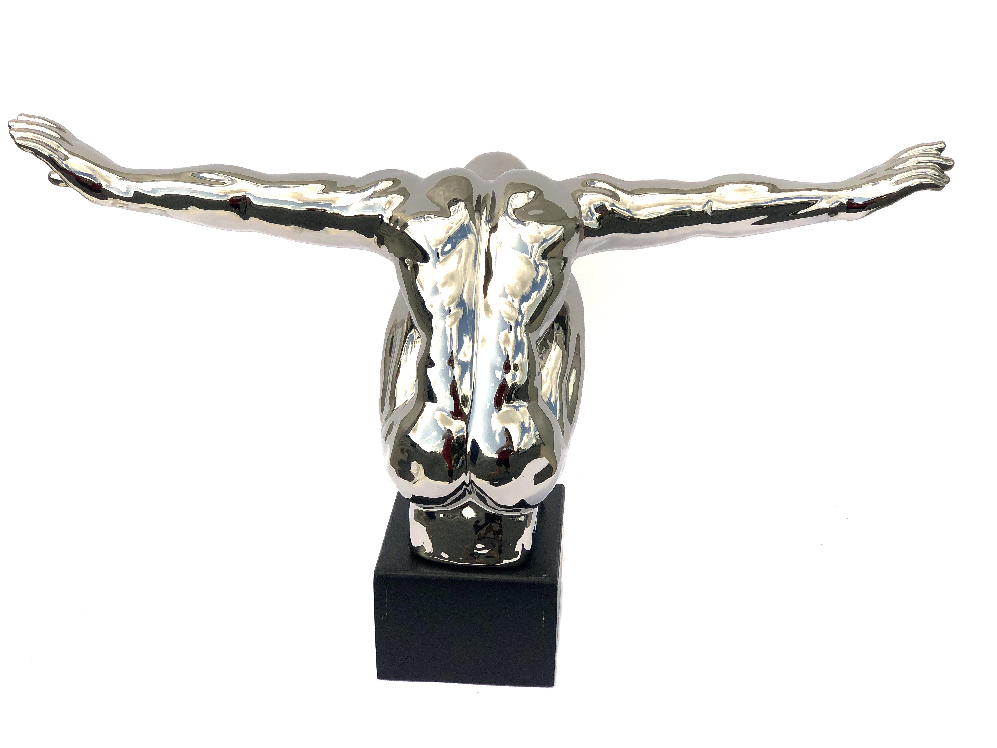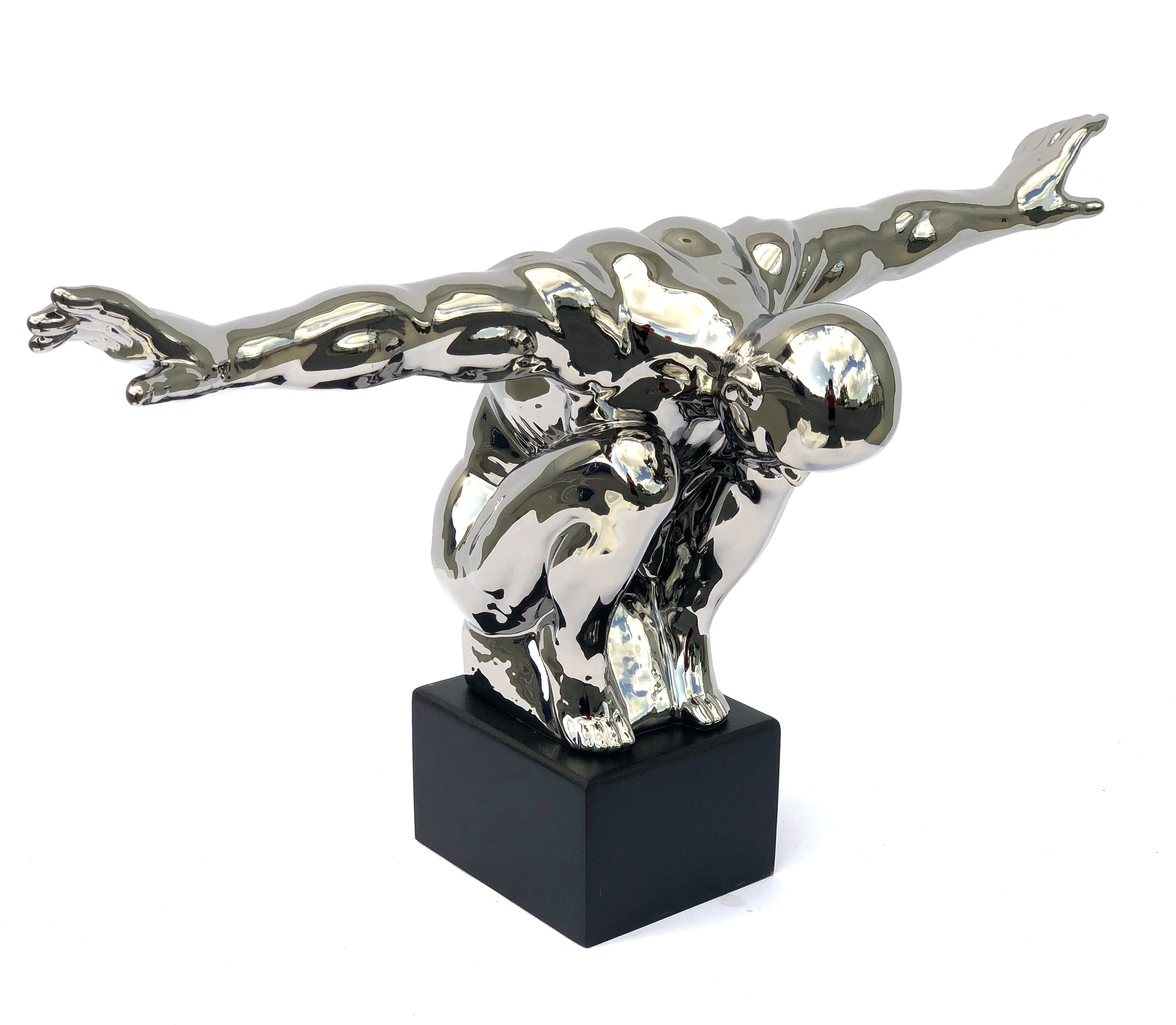 A Stunning Sculpture …... The Mirrored Chrome Crouching Diver Sculpture on Black Base. The Statue depicts a well proportioned crouching man reaching outward, inviting viewers to stop and think. The creation is Artist Cast in Porcelain. Then plated with Chrome and mirrored using high speed hand polishing and finishing, creating this never before achieved decorative result. No Assembly Required!