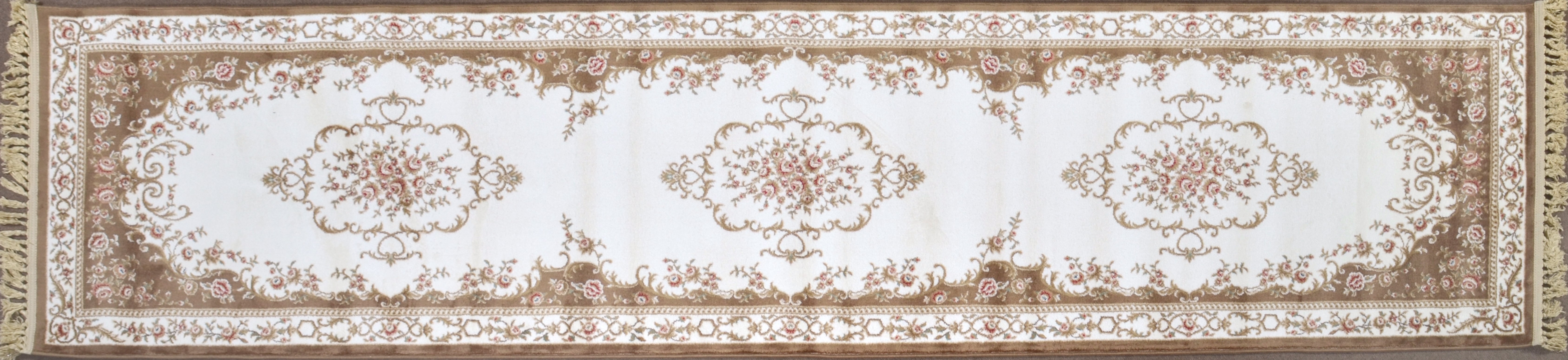 Offered is a beautiful Aubusson Design Rug. A well sized 3 x 10 foot runner in beige and soft browns. This pleasing French Designed Rug will help define spaces, accent furniture, or simply add some welcome color and texture to a room. The history of Aubusson design dates back to the 14th century. The town of Aubusson is located in the La Marche area of France. This modern interpretation is manufactured using a lustrous Viscose pile referred to also as synthetic silk. When combined with its 1 million point manufacturing detail made possible by production using a state of the art face-to-face power loom assures the highest consistent quality across all its designs. There are many popular sizes offered in this TIMELESS TREASURES RUG COLLECTION, consider matching this runner with one of its bigger Aubusson designed Matching room rugs with one of its bigger Aubusson designed Matching room rugs for a complete statement of luxury!