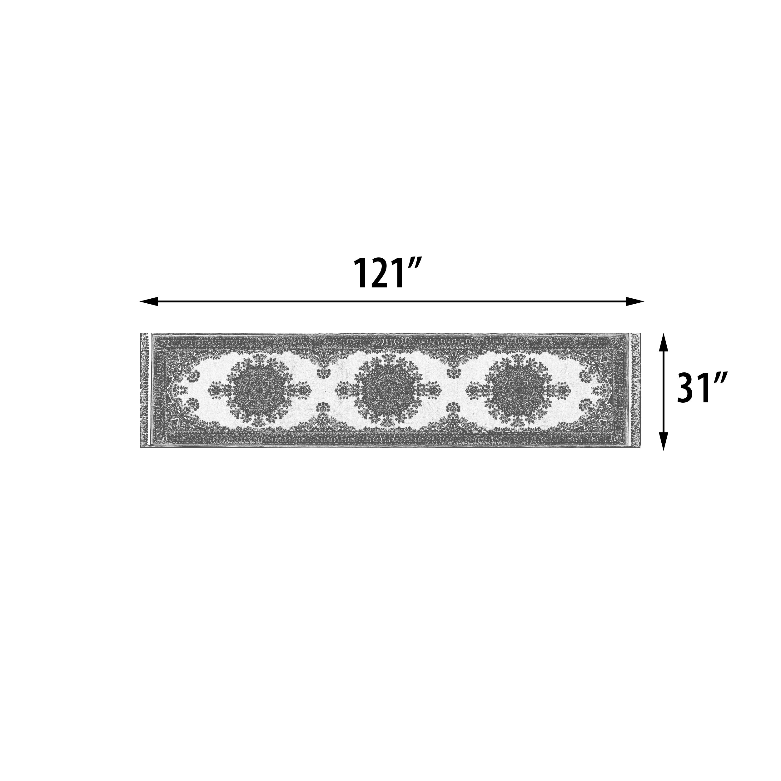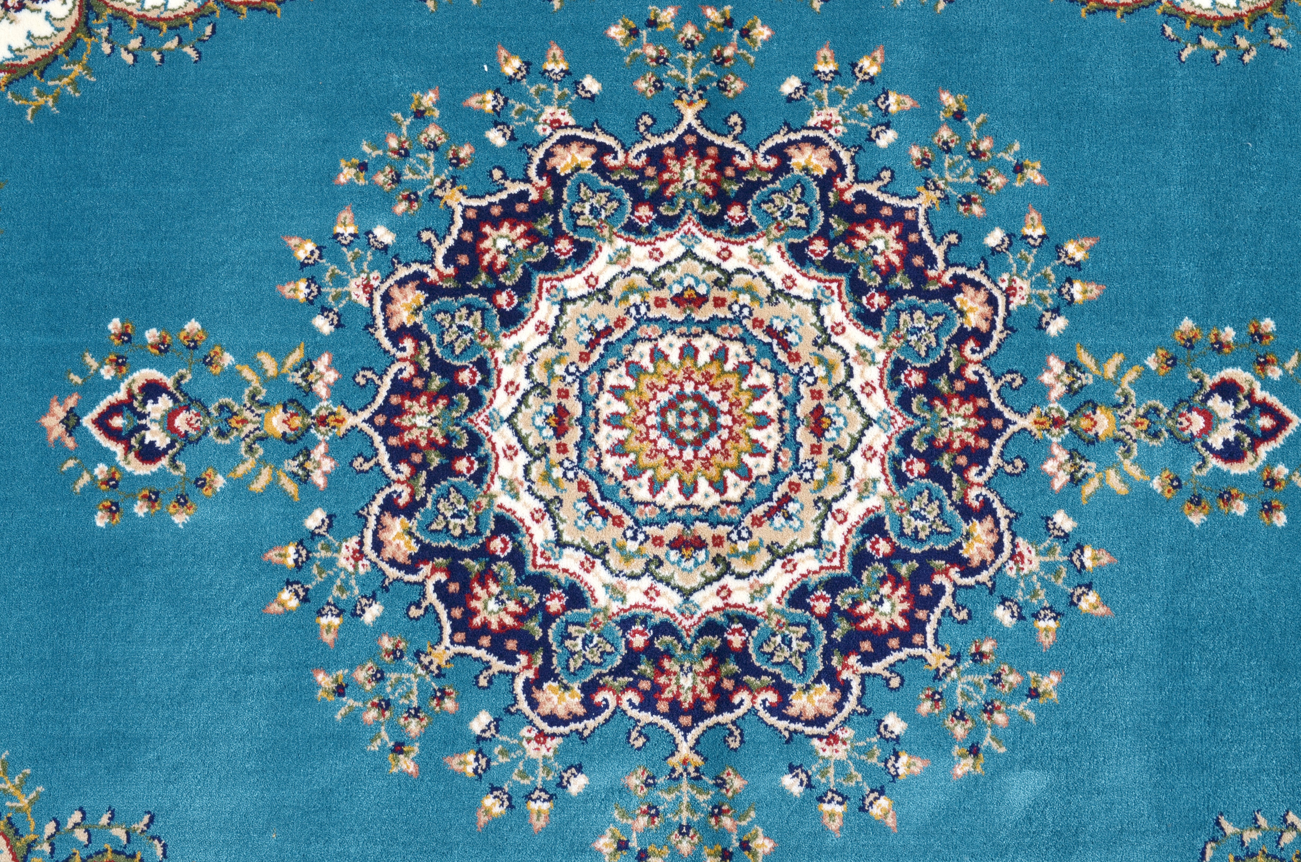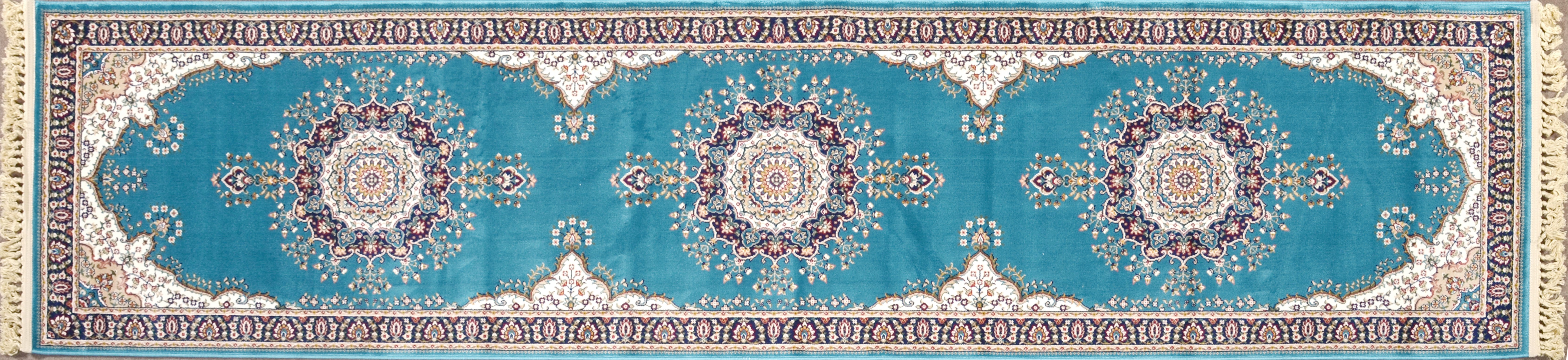 One of the newest additions to our Persian Style Palace Rugs is this 3 x 10 foot long runner from our spectacular, Kashan Design Blue Collection. So striking in beauty and first impression. This is spectacular color combination with Turquoise Teal Blue Fields surrounded by exciting accent colors offering contrast with dark Black Blue, Cream and touches of Burgundy. Designer's understand that floor is the foundation of any well designed room as we naturally look were we walk. This Kashan Design Blue Palace Rug will create a stunning first impression and will certainly help define spaces, accent furniture, or simply add some welcome color and texture to a room. The history of Kashan design's originate from Kashan an oasis town along the Kavir desert, in central Iran. It is one of the oldest cities in Iran, As early as the 17th century Kashan had a well established silk area rug industry. Coveting by kings, at one time it was commonplace to see Kashan rugs hanging on palace walls all over the world. It is for this reason that it is also referred to as “the palace carpet”. This modern interpretation is manufactured using a lustrous Viscose pile referred to also as synthetic silk. When combined with its 1 million point manufacturing detail made possible by production using a state of the art face-to-face power loom assures the highest consistent quality across all its designs. There are many popular sizes offered in this TIMELESS TREASURES RUG COLLECTION, consider matching this runner with one of its matching accent rugs or room sized offerings for a fresh take of style and color in Timeless Old World Luxury!