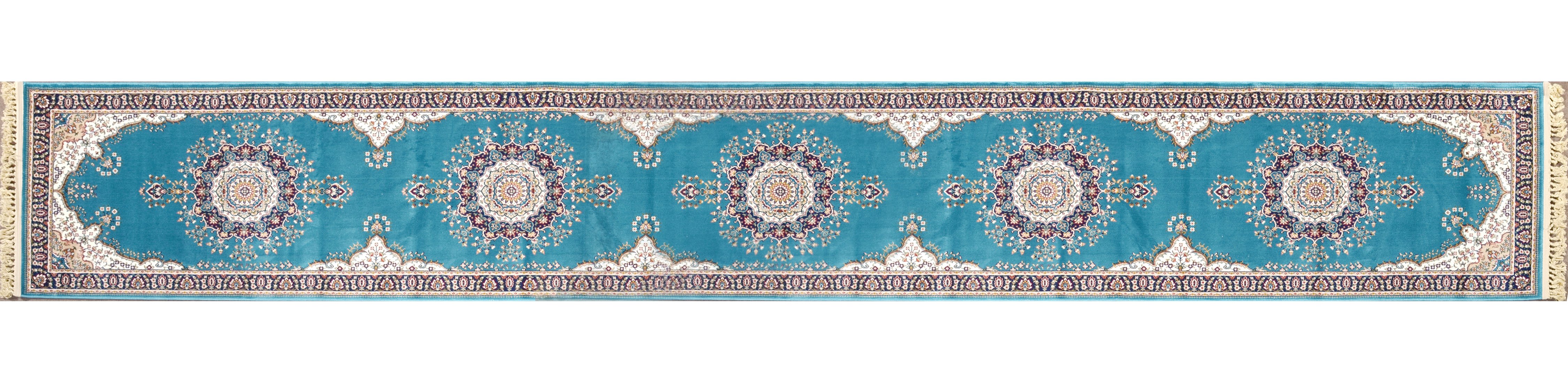 One of the newest additions to our Persian Style Palace Rugs is this 3 x 18 foot long runner from our spectacular, Kashan Design Blue Collection. So striking in beauty and first impression. A perfect option for an extra long hallway or even a set of stairs. This is spectacular color combination with Turquoise Teal Blue Fields surrounded by exciting accent colors offering contrast with dark Black Blue, Cream and touches of Burgundy. Designer's understand that floor is the foundation of any well designed room as we naturally look were we walk. This Kashan Design Blue Palace Rug will create a stunning first impression and will certainly help define spaces, accent furniture, or simply add some welcome color and texture to a room. The history of Kashan design's originate from Kashan an oasis town along the Kavir desert, in central Iran. It is one of the oldest cities in Iran, As early as the 17th century Kashan had a well established silk area rug industry. Coveting by kings, at one time it was commonplace to see Kashan rugs hanging on palace walls all over the world. It is for this reason that it is also referred to as the palace carpet. This modern interpretation is manufactured using a lustrous Viscose pile referred to also as synthetic silk. When combined with its 1 million point manufacturing detail made possible by production using a state of the art face-to-face power loom assures the highest consistent quality across all its designs. There are many popular sizes offered in this TIMELESS TREASURES RUG COLLECTION, consider matching this runner with one of its matching accent rugs or room sized offerings for a fresh take of style and color in Timeless Old World Luxury!