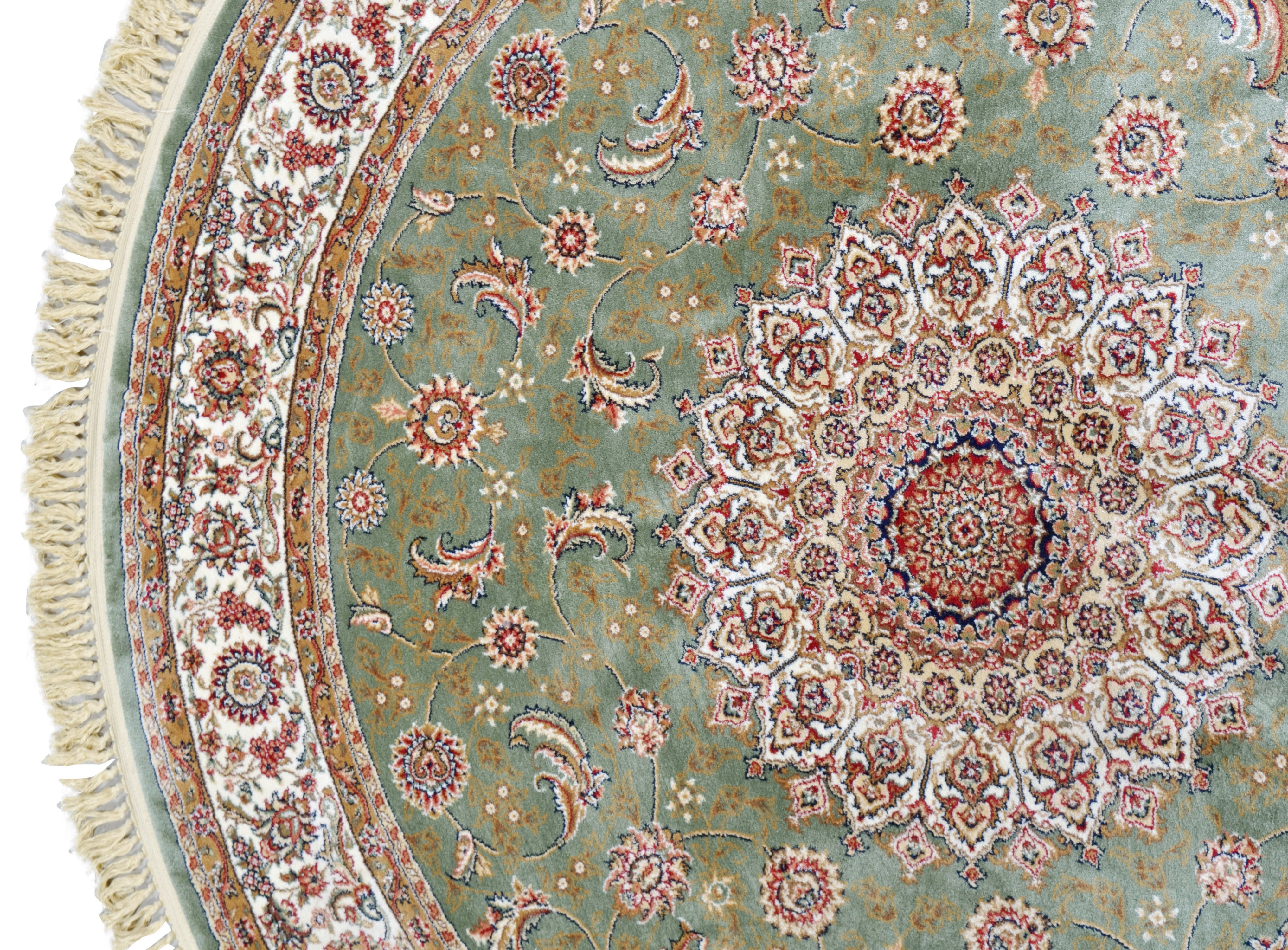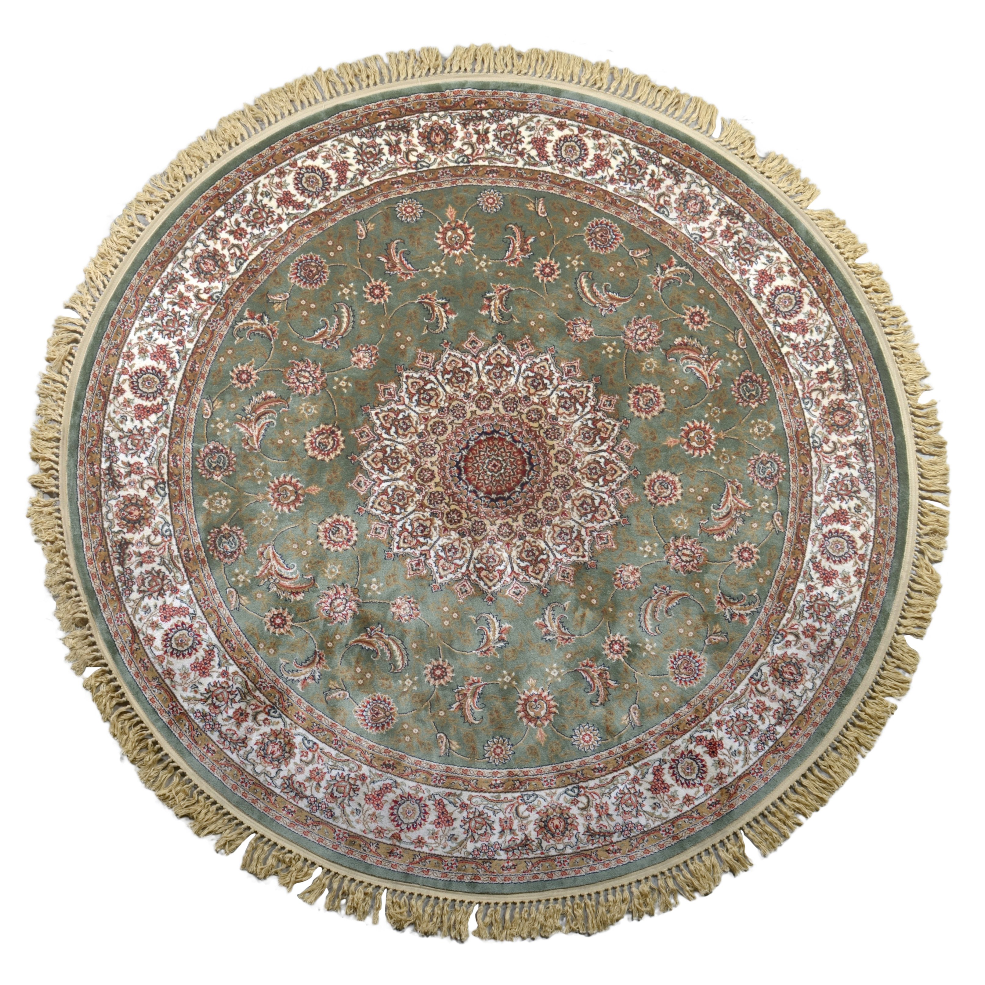 Offered is a 7 x 7 foot round entry carpet from our fine Isfahan Design Green Ivory Collection. Designer's understand that floor is the foundation of any well designed room as we naturally look were we walk. This Green Ivory Isfahan Design rug will create a beautiful first impression and will help define spaces, accent furniture, or simply add some welcome color and texture to a room. The Iranian city of Isfahan has long been one of the centers for production of the famous Persian carpet or rug. Isfahan carpets are renowned for their high quality. Both Classical and contemporary Isfahan’s are extremely attractive, and the subduing of the palette, particularly the elimination of strong reds, makes them more compatible with Western decorative schemes. This modern interpretation is manufactured using a lustrous Viscose pile referred to also as synthetic silk. When combined with its 1 million point manufacturing detail made possible by production using a state of the art face-to-face power loom assures the highest consistent quality across all its designs. There are many popular sizes offered in this TIMELESS TREASURES RUG COLLECTION, consider matching this rug with one of its matching Isfahan Green Ivory designed Matching runners or room rugs for a complete statement of Rich Old World Luxury!