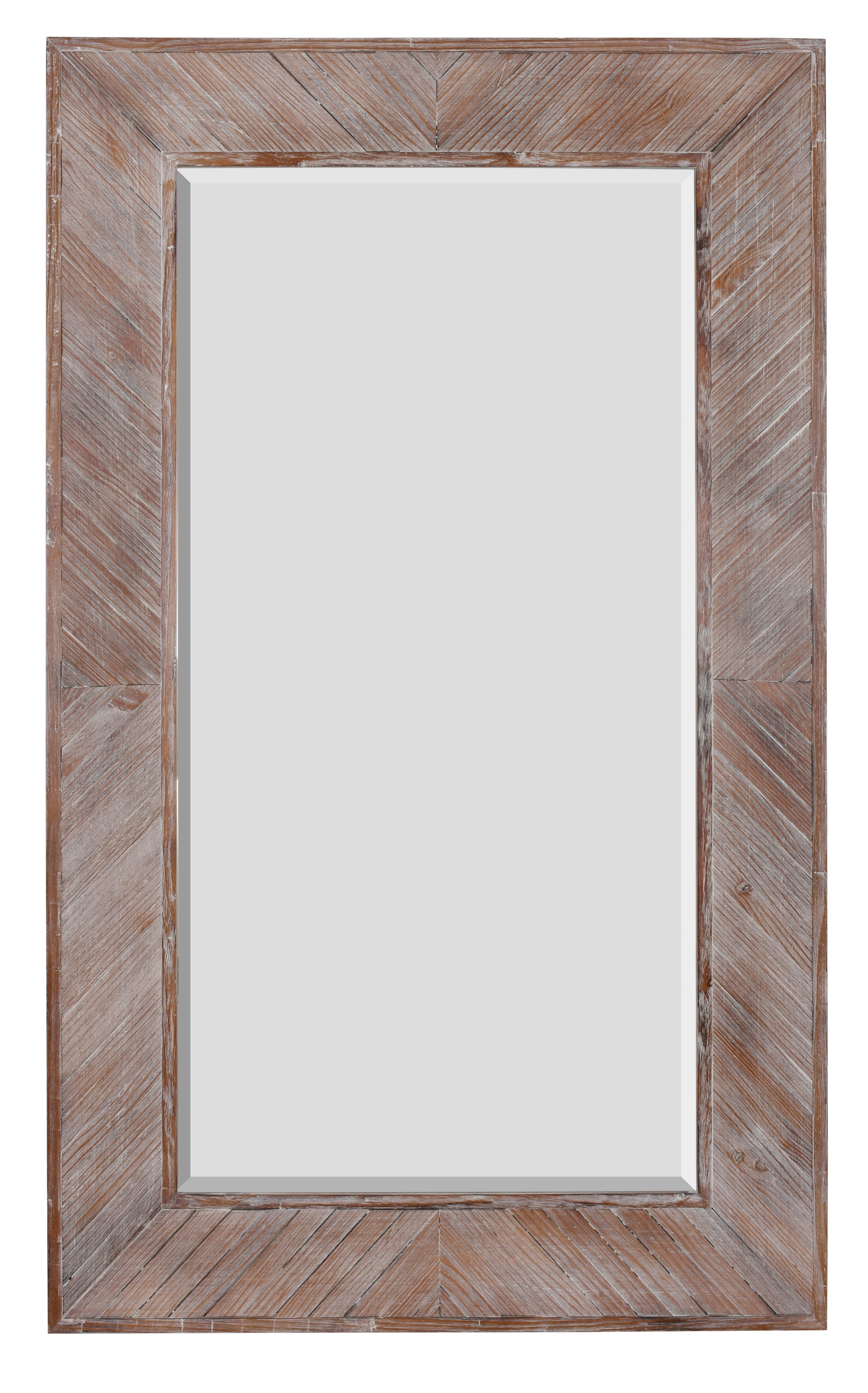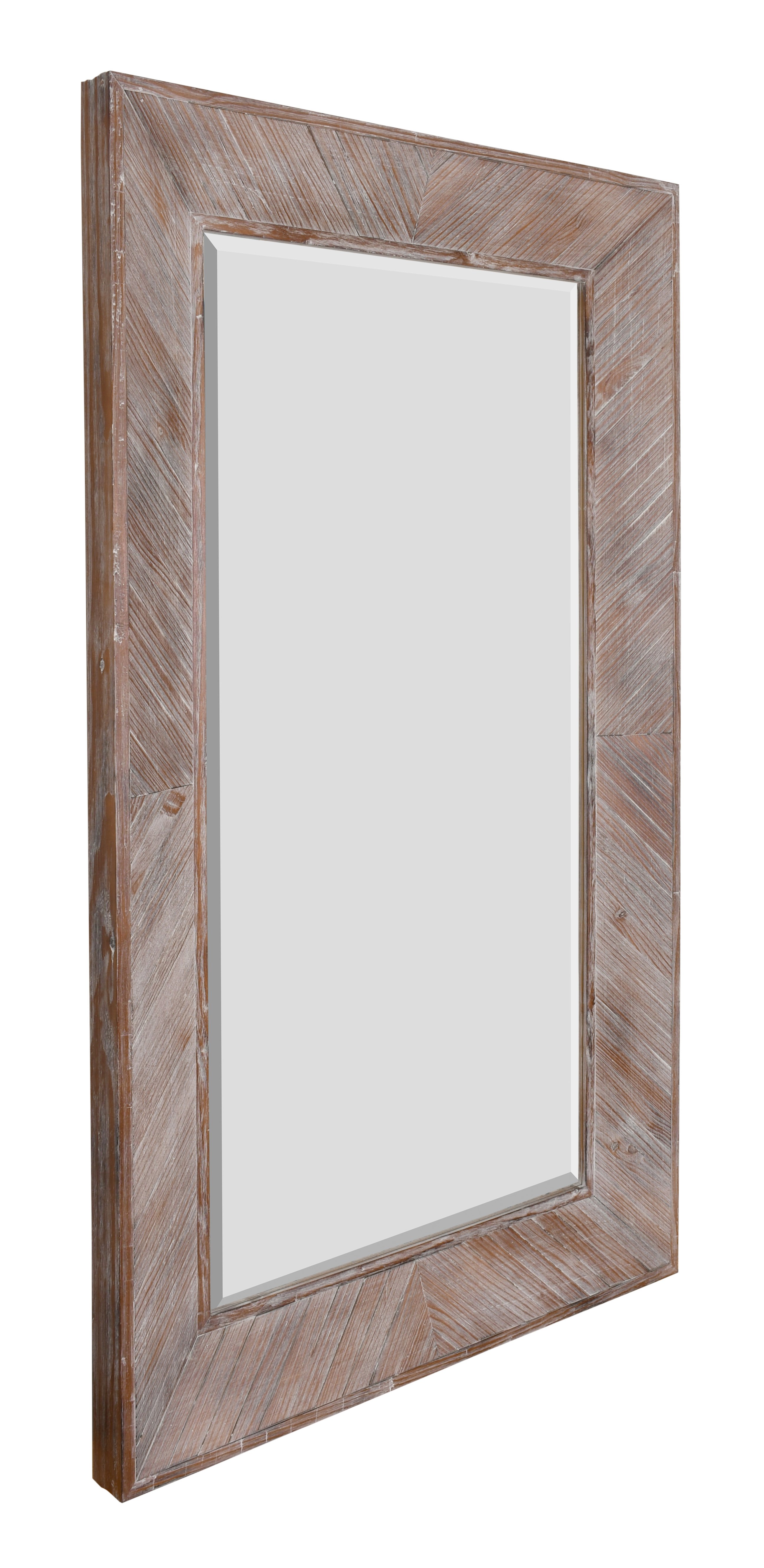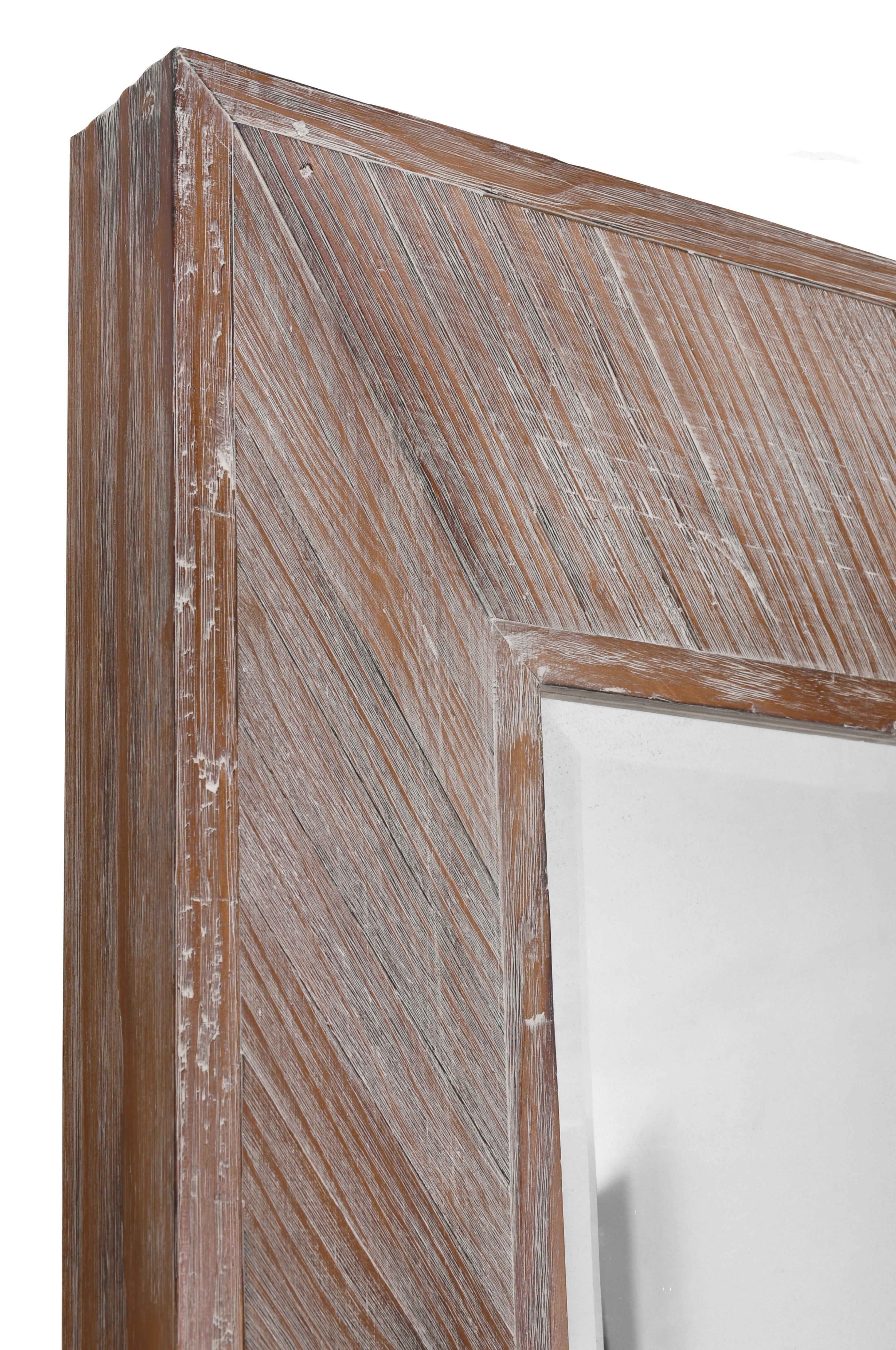 Our Herringbone Mirror is a larger mirror. Shaped for use as a leaning mirror this style is versatile and can be hung either Vertically or Horizontal with the customer friendly provided and mounted hooks on back. The craftsman hand assembled hard wood slats and created the popular Herringbone pattern. Then hand finished in a slight washed natural wood affect. The mirror has a deep projection from the wall and is created to offer a larger scale. The mirror comes with a 1 and 1/4 Inch bevel mirror installed. Another quality mirror from Timeless Reflections a division of AFD Home