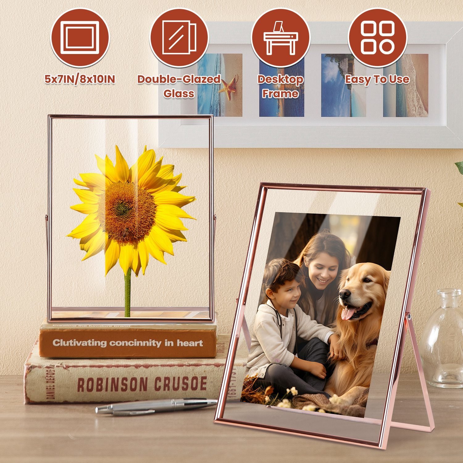2Pcs Standing Rose Gold Metal Picture Frames 5x7IN 8x10IN Vertical Tabletop Floating Photo Frame