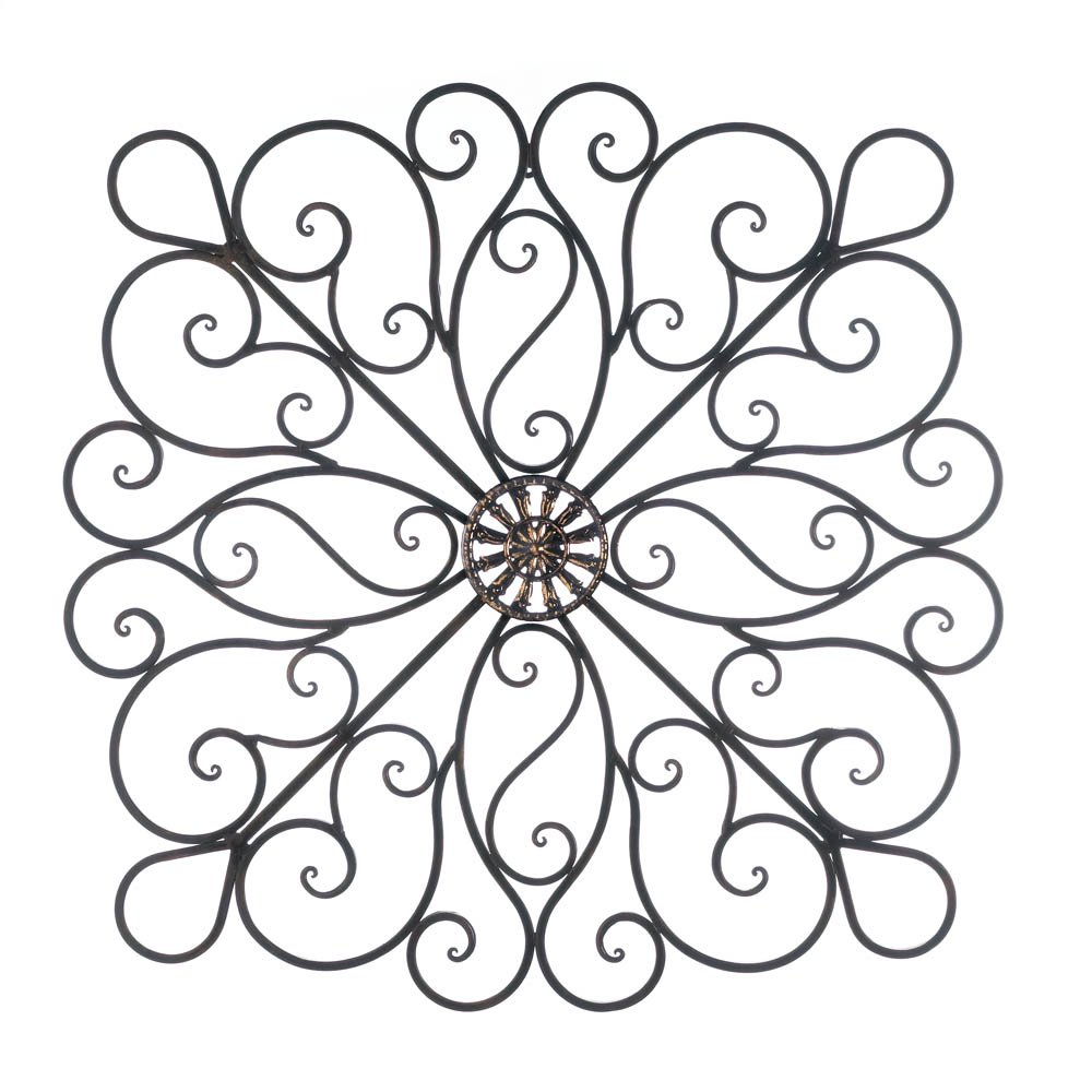 • Give your wall a dramatically stylish makeover simply by hanging this impressive iron decor. Curling waves of wrought iron wisp and wander from the center metallic ornament to make a modern statement.